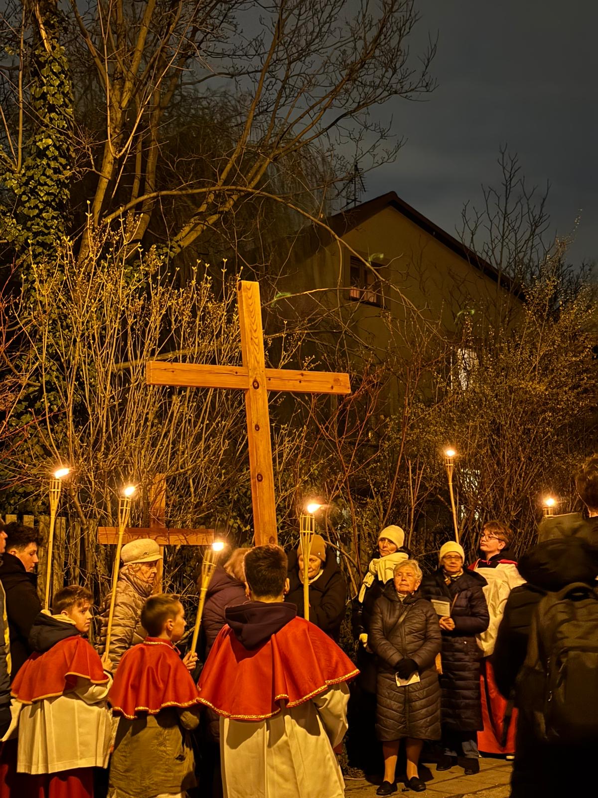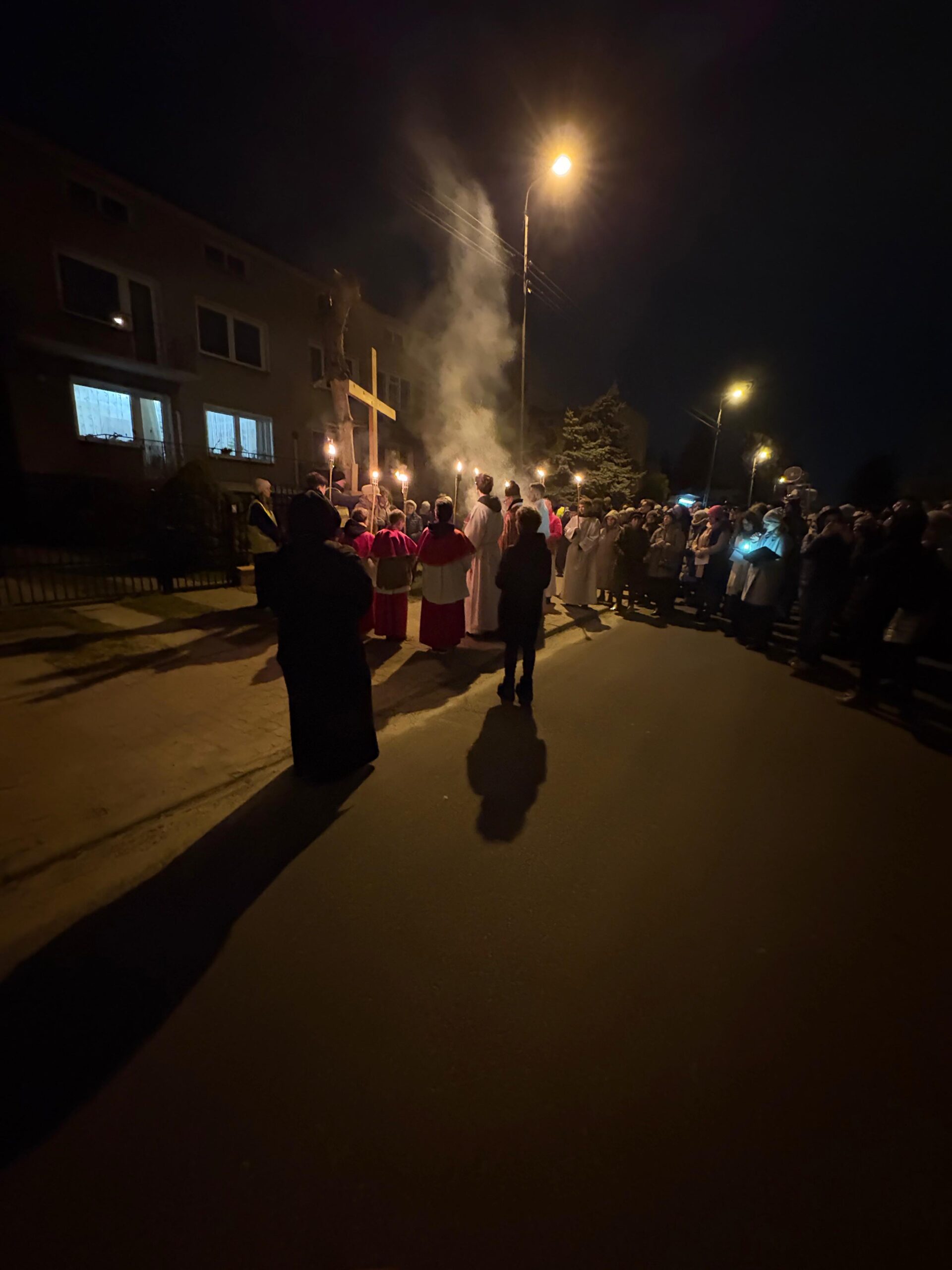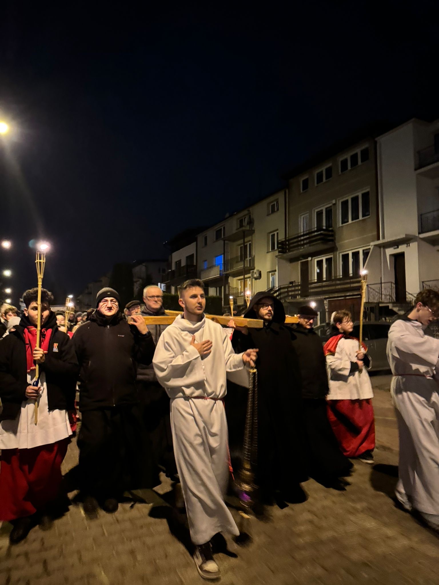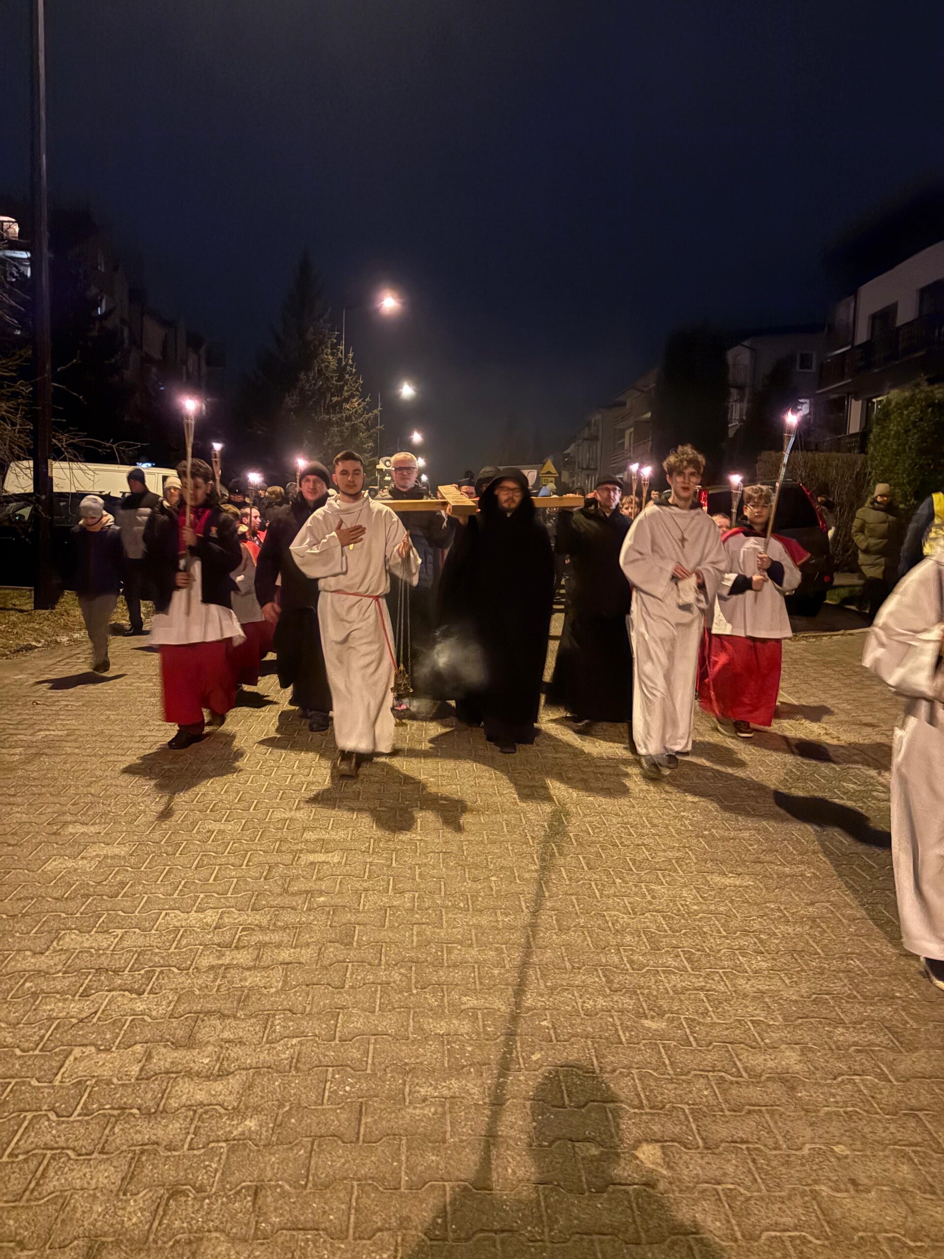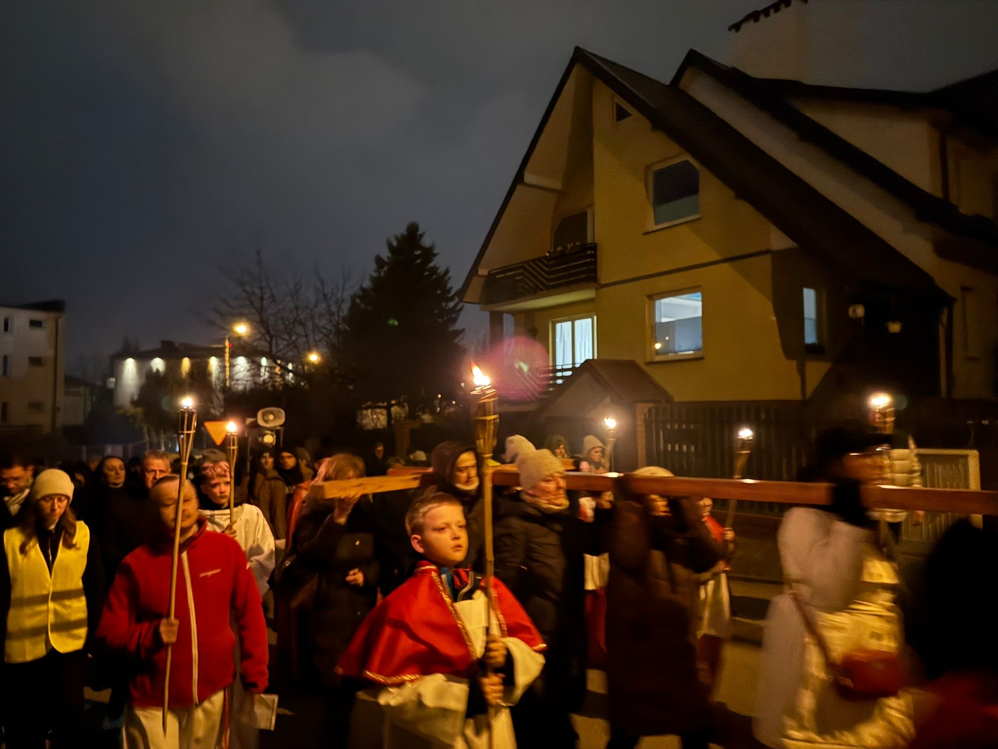 W piątek, 27 marca 2026 roku wierni rozważali kolejne stacje drogi krzyżowej idąc ulicami Parafii. Modlitwie przewodniczył ks. Dominik Gaładyk, S.A.C., wikariusz. Tegoroczne rozważania przygotowała wspólnota Kościoła Domowego.