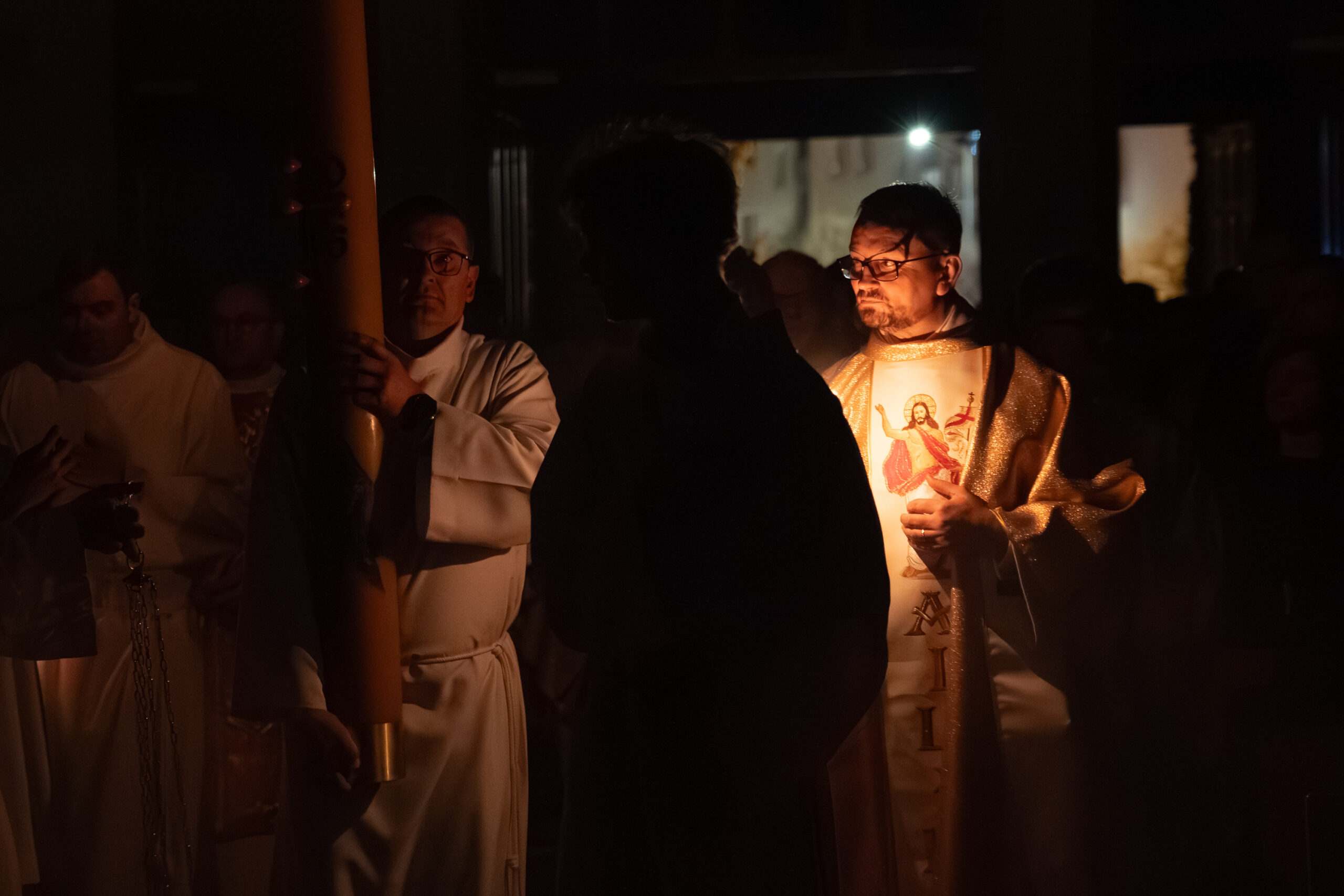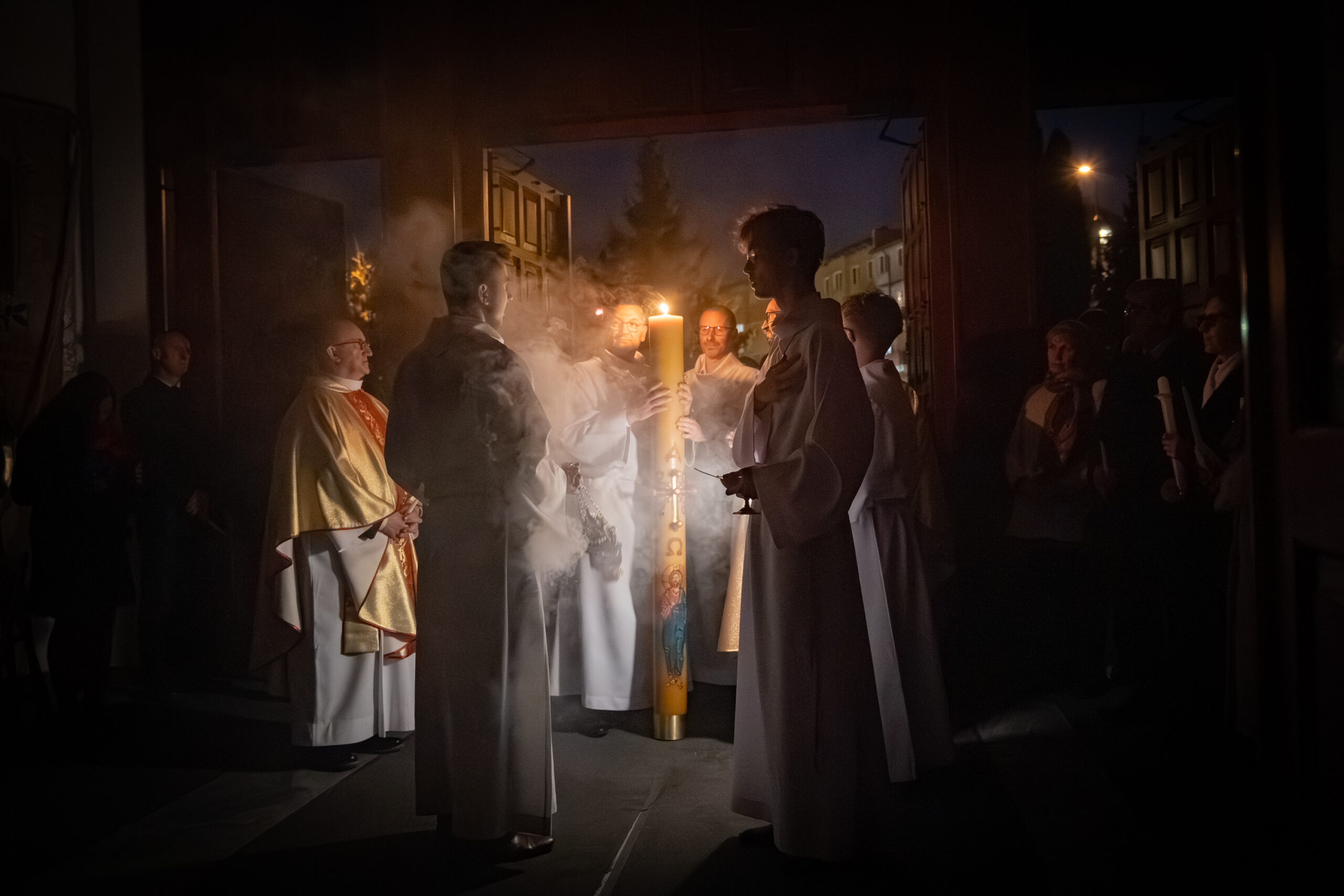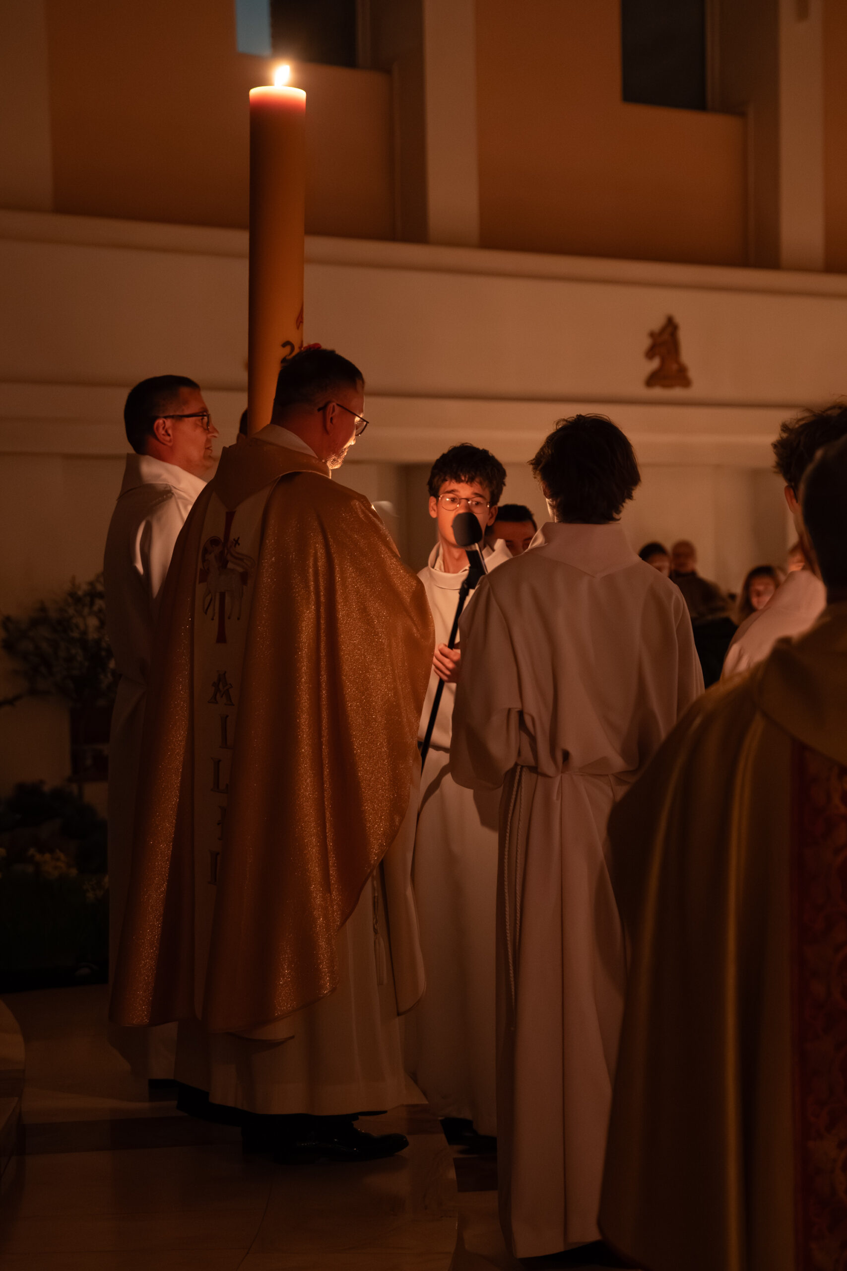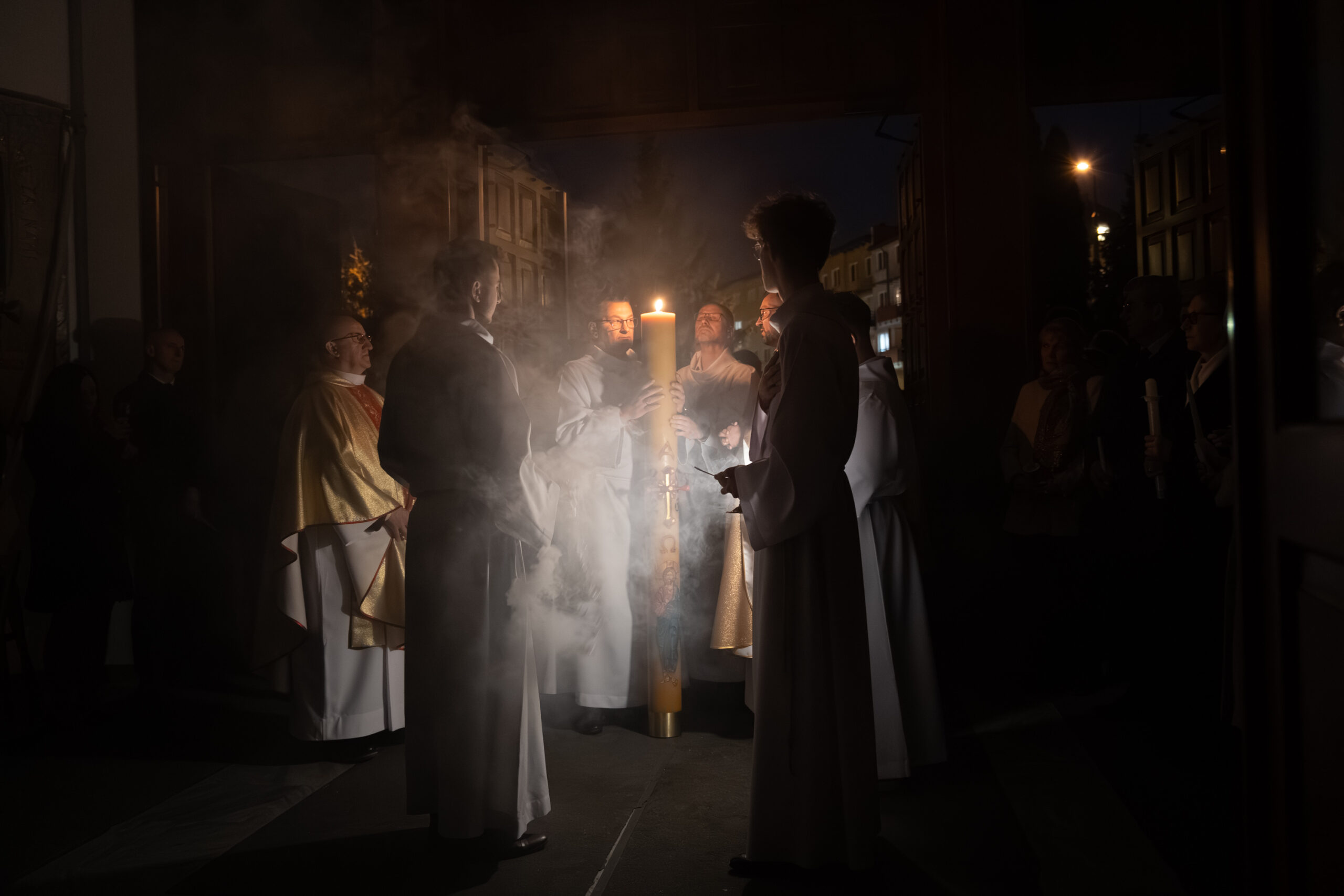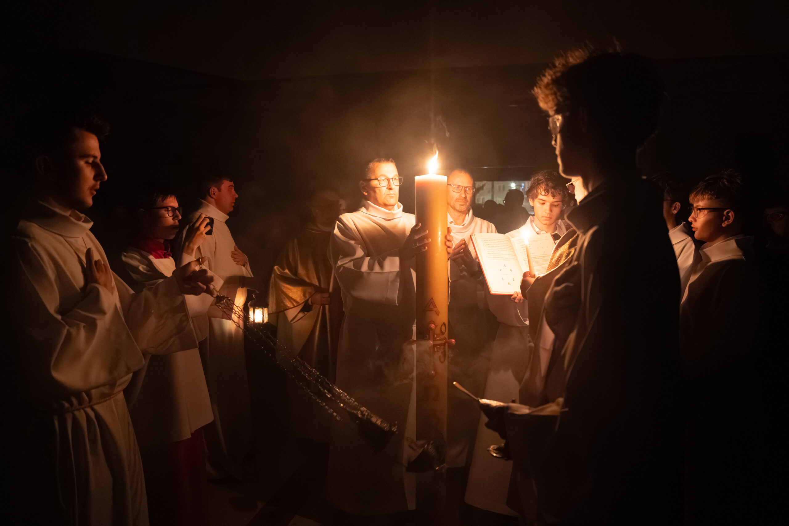 Liturgia rozpoczęła się od obrzędu światła – poświęcenia ognia i zapalenia Paschału, który symbolizuje Chrystusa Zmartwychwstałego, rozpraszającego ciemności grzechu i śmierci. Następnie odśpiewany został przez ks. Dominika Gaładyka, S.A.C., uroczysty Exsultet, czyli starożytne orędzie wielkanocne. Jest to podniosły hymn wykonywany na początku Wigilii Paschalnej, który wzywa całe stworzenie do radości i wychwala Boga za dar zbawienia oraz zwycięstwo Chrystusa nad śmiercią.