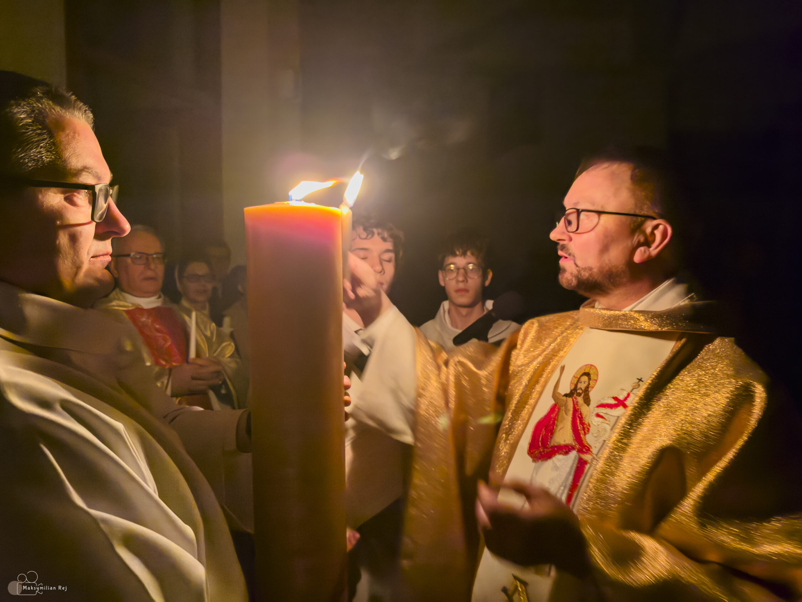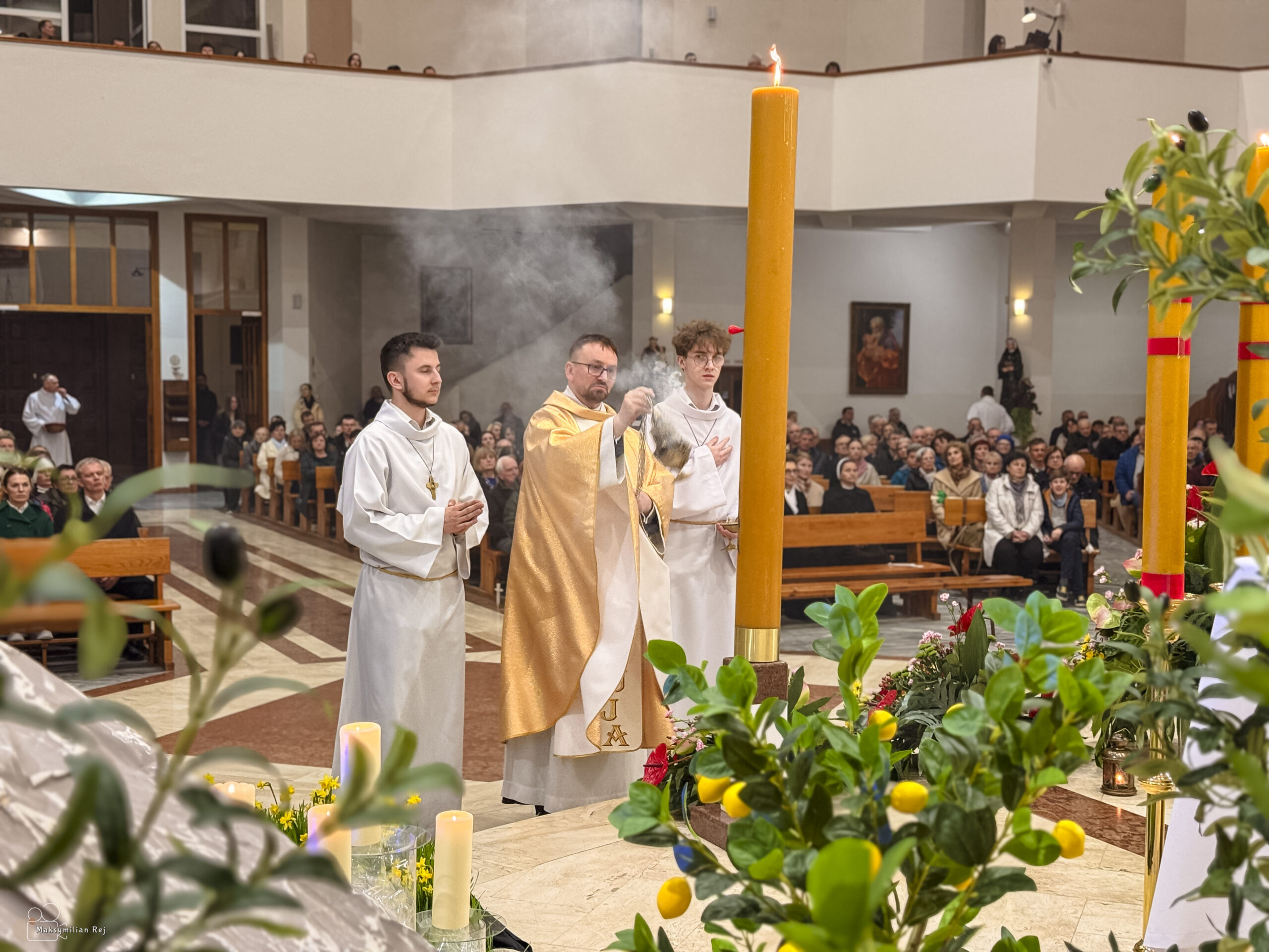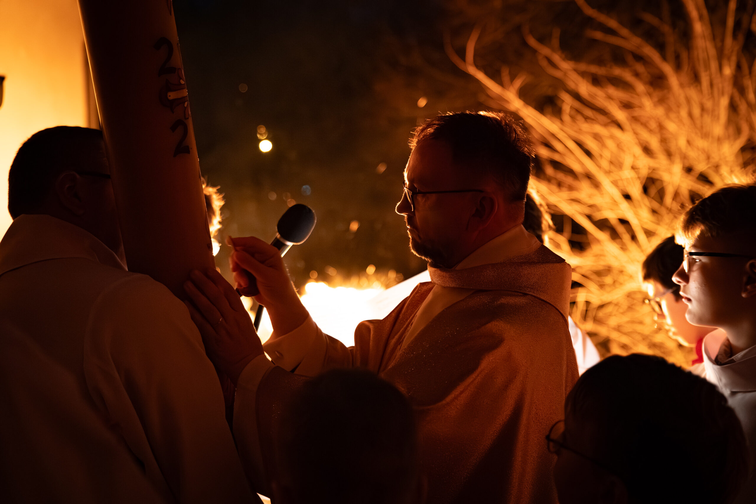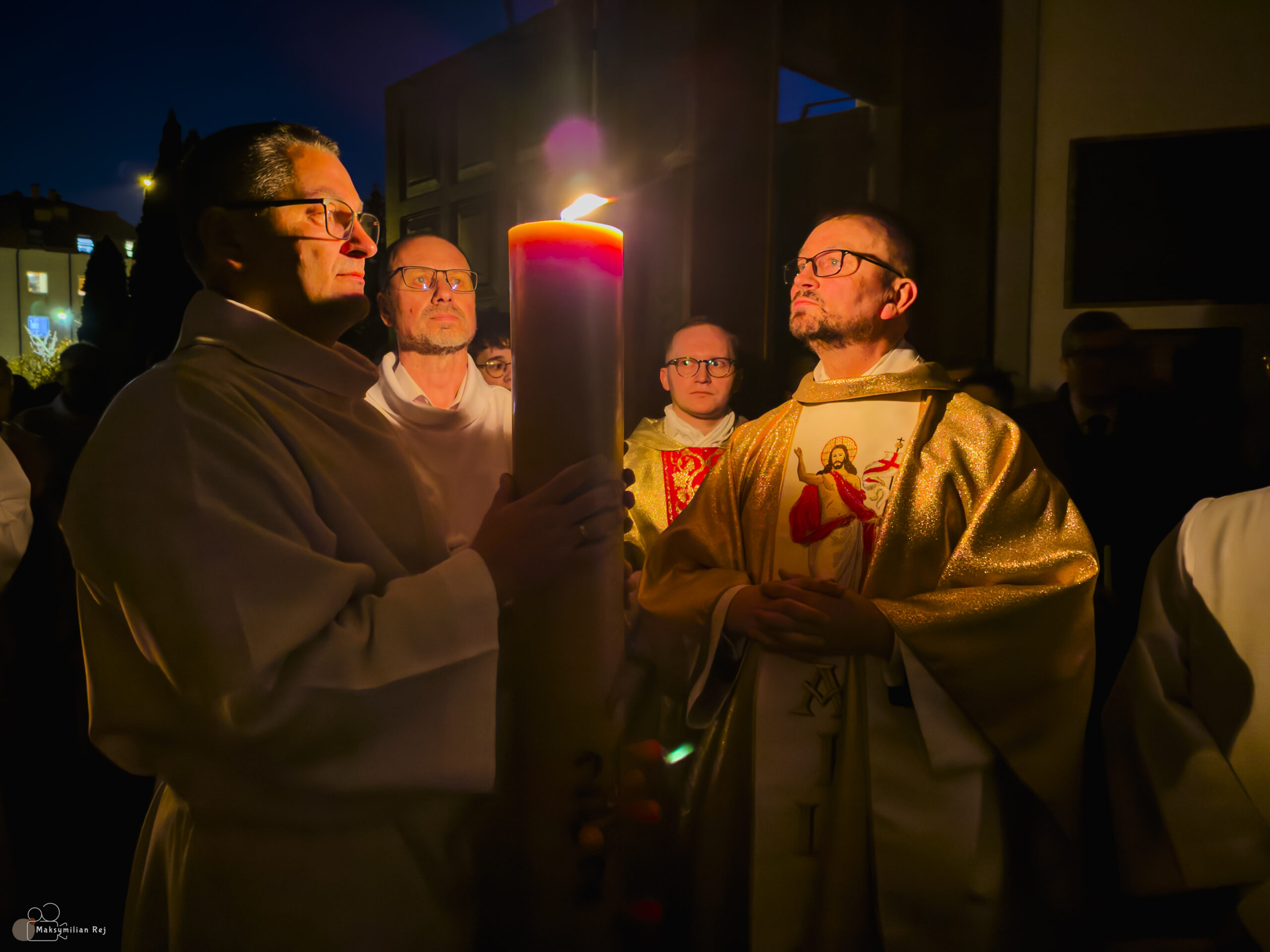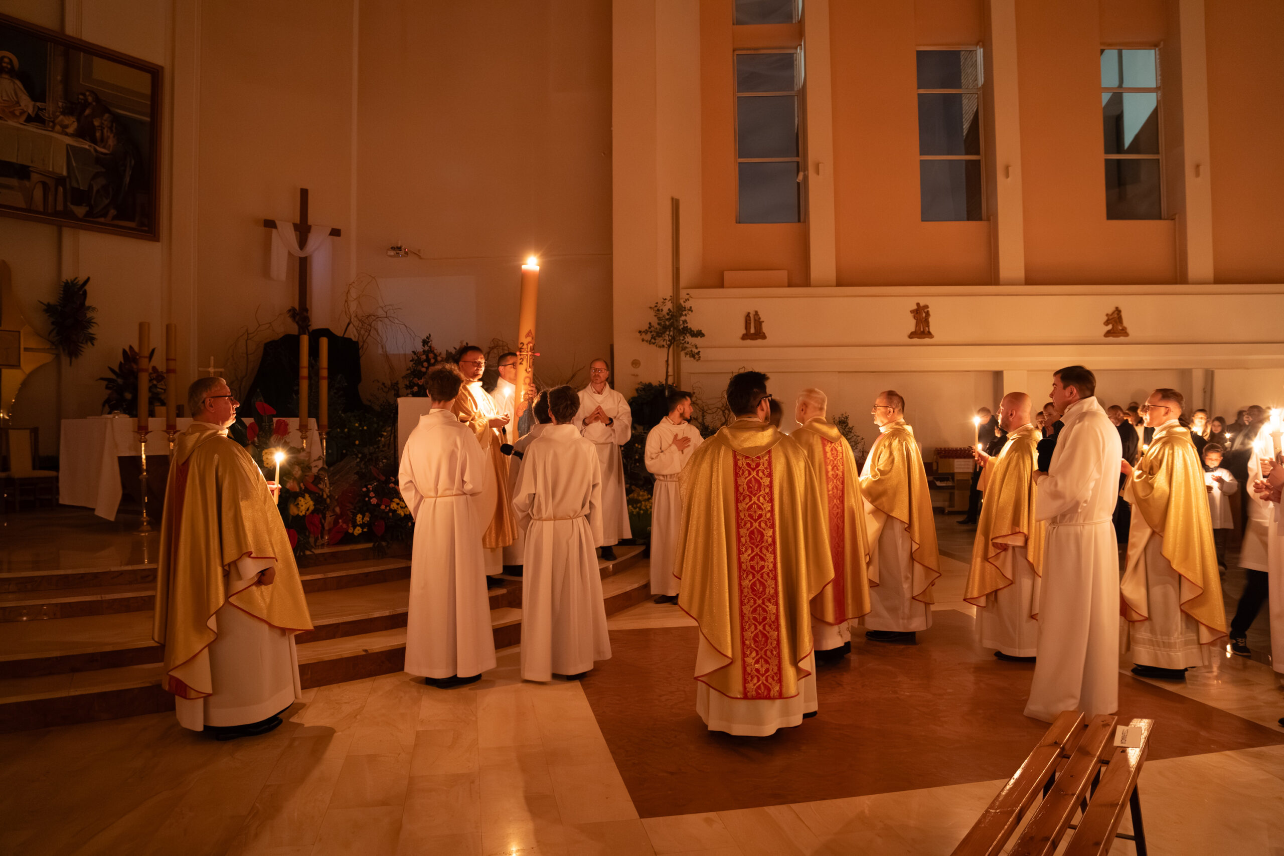 Liturgia rozpoczęła się od obrzędu światła – poświęcenia ognia i zapalenia Paschału, który symbolizuje Chrystusa Zmartwychwstałego, rozpraszającego ciemności grzechu i śmierci. Następnie odśpiewany został przez ks. Dominika Gaładyka, S.A.C., uroczysty Exsultet, czyli starożytne orędzie wielkanocne. Jest to podniosły hymn wykonywany na początku Wigilii Paschalnej, który wzywa całe stworzenie do radości i wychwala Boga za dar zbawienia oraz zwycięstwo Chrystusa nad śmiercią.