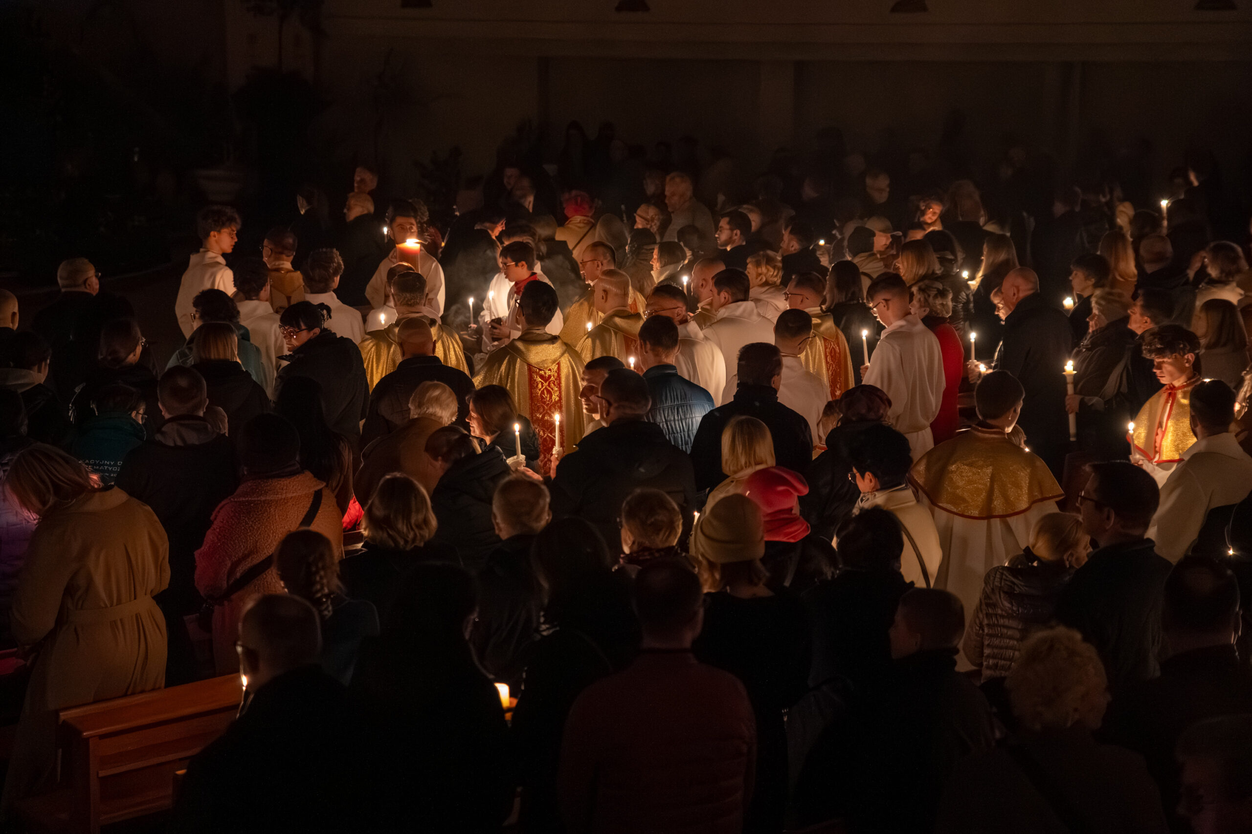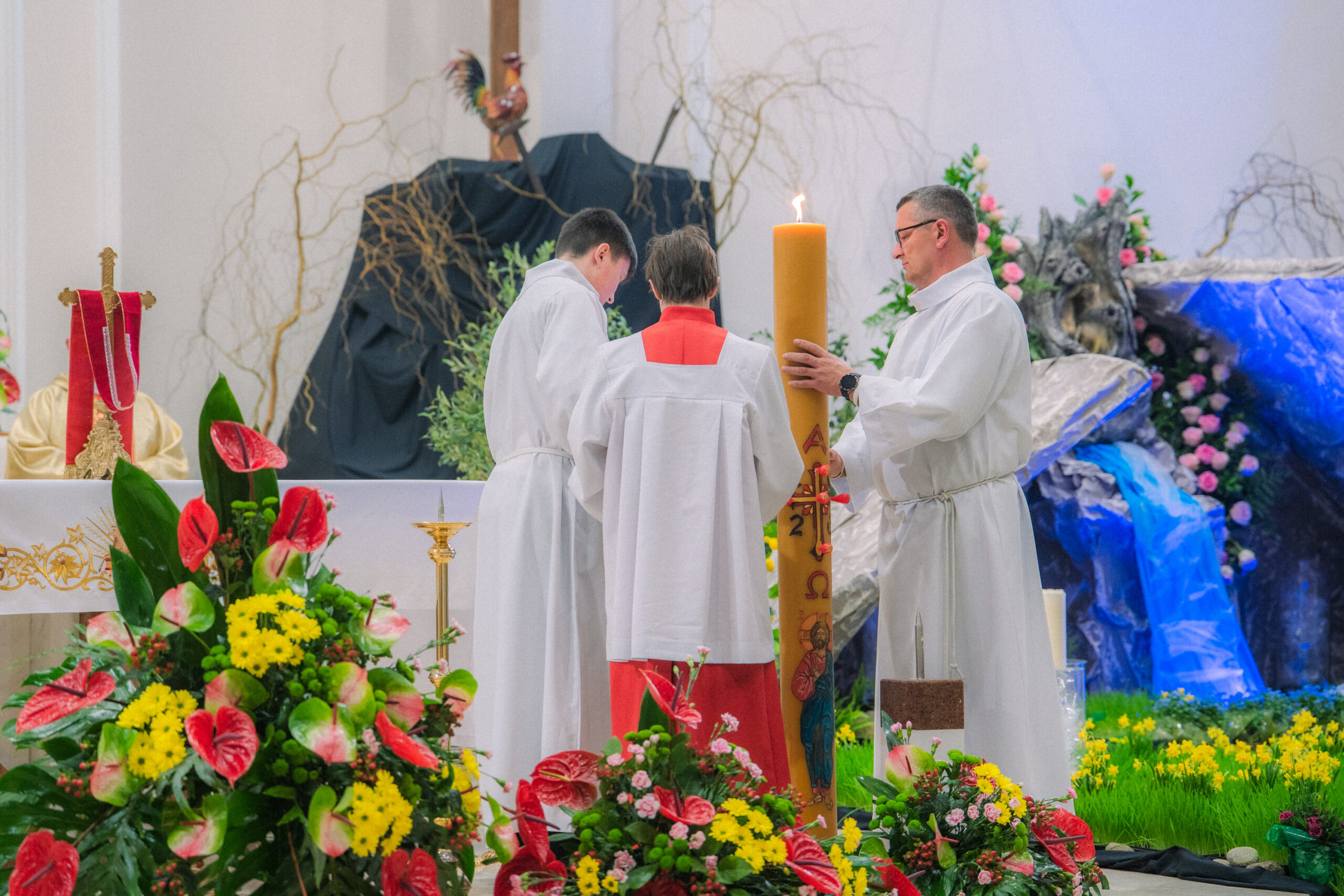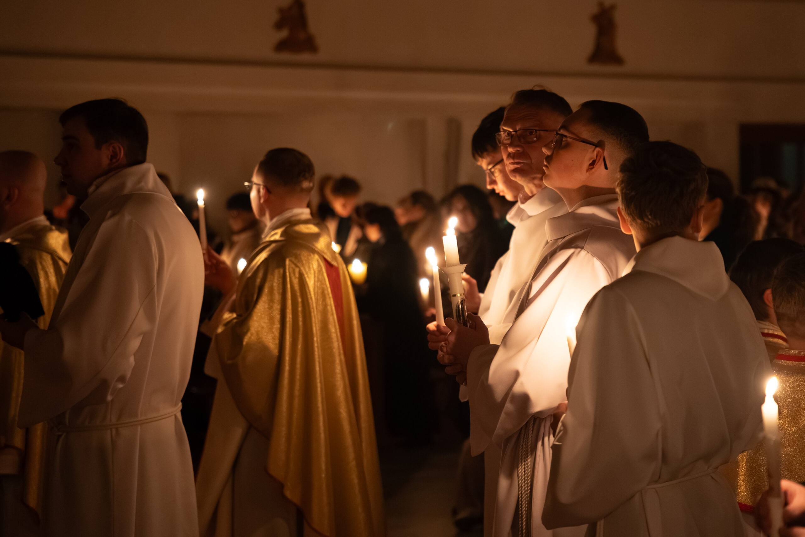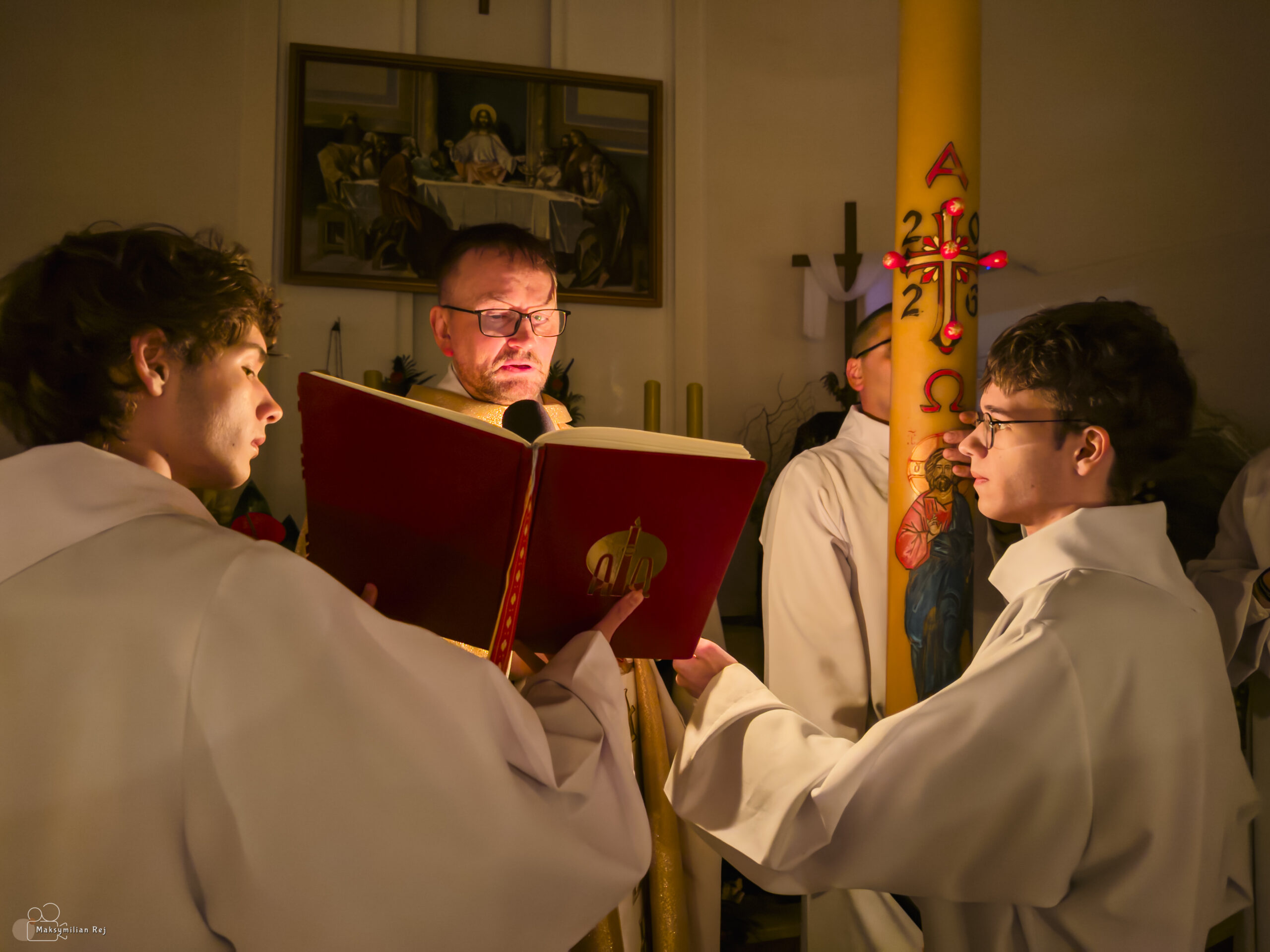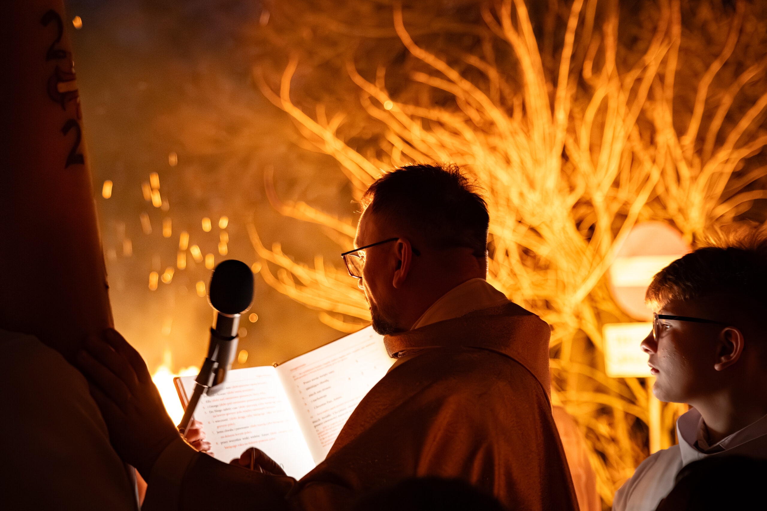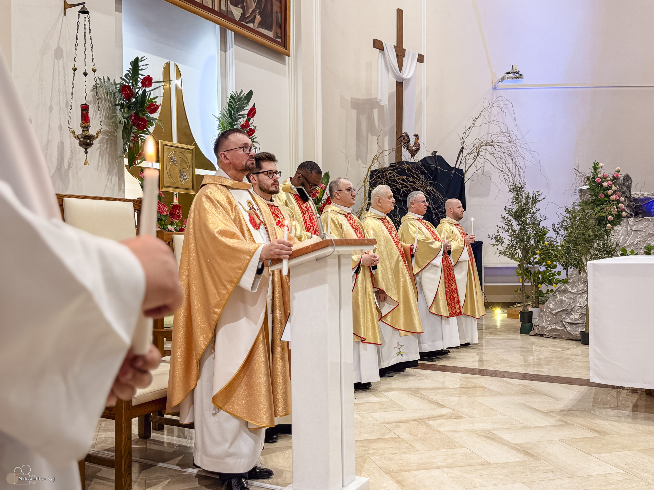 Liturgia rozpoczęła się od obrzędu światła – poświęcenia ognia i zapalenia Paschału, który symbolizuje Chrystusa Zmartwychwstałego, rozpraszającego ciemności grzechu i śmierci. Następnie odśpiewany został przez ks. Dominika Gaładyka, S.A.C., uroczysty Exsultet, czyli starożytne orędzie wielkanocne. Jest to podniosły hymn wykonywany na początku Wigilii Paschalnej, który wzywa całe stworzenie do radości i wychwala Boga za dar zbawienia oraz zwycięstwo Chrystusa nad śmiercią.