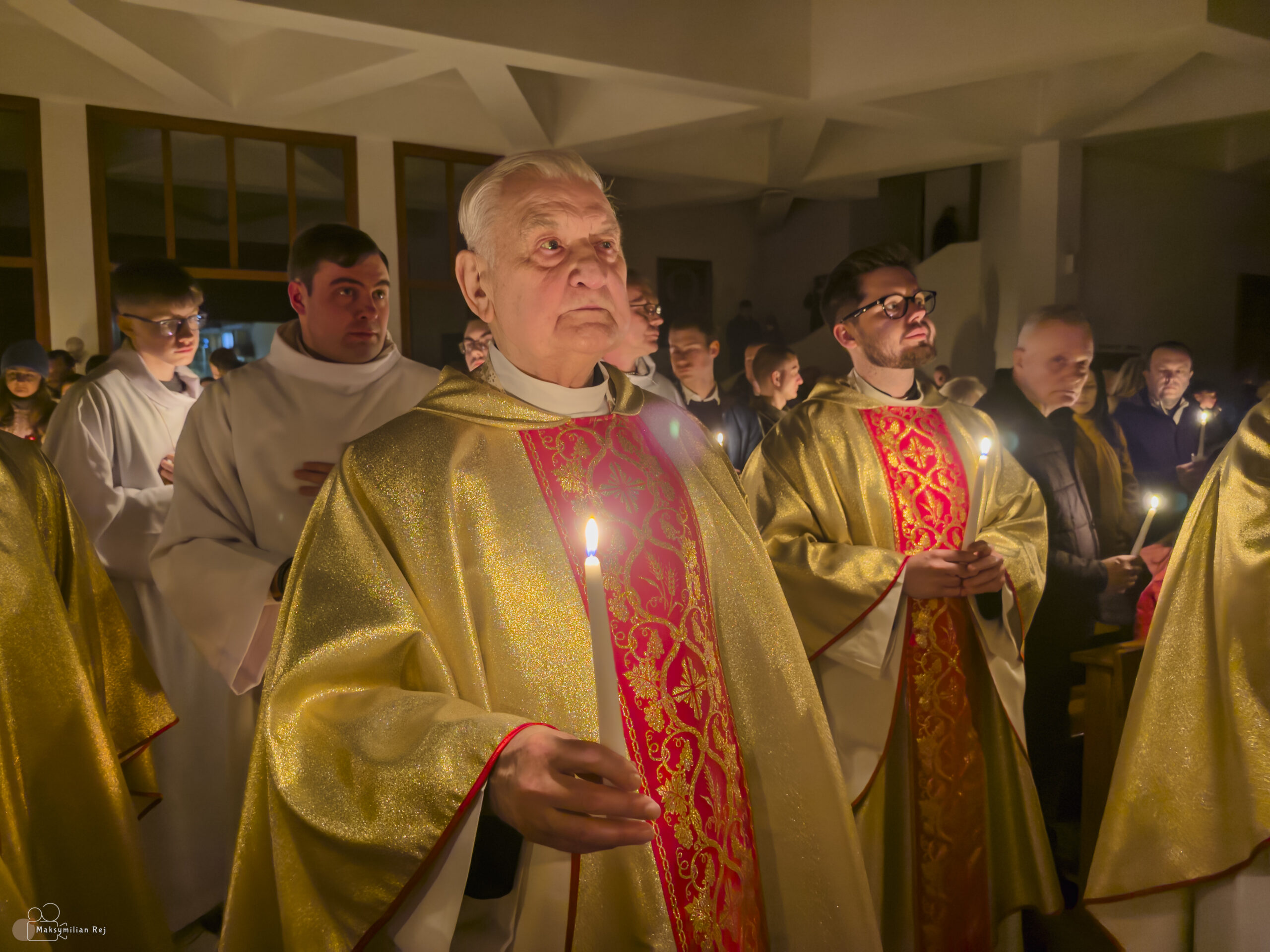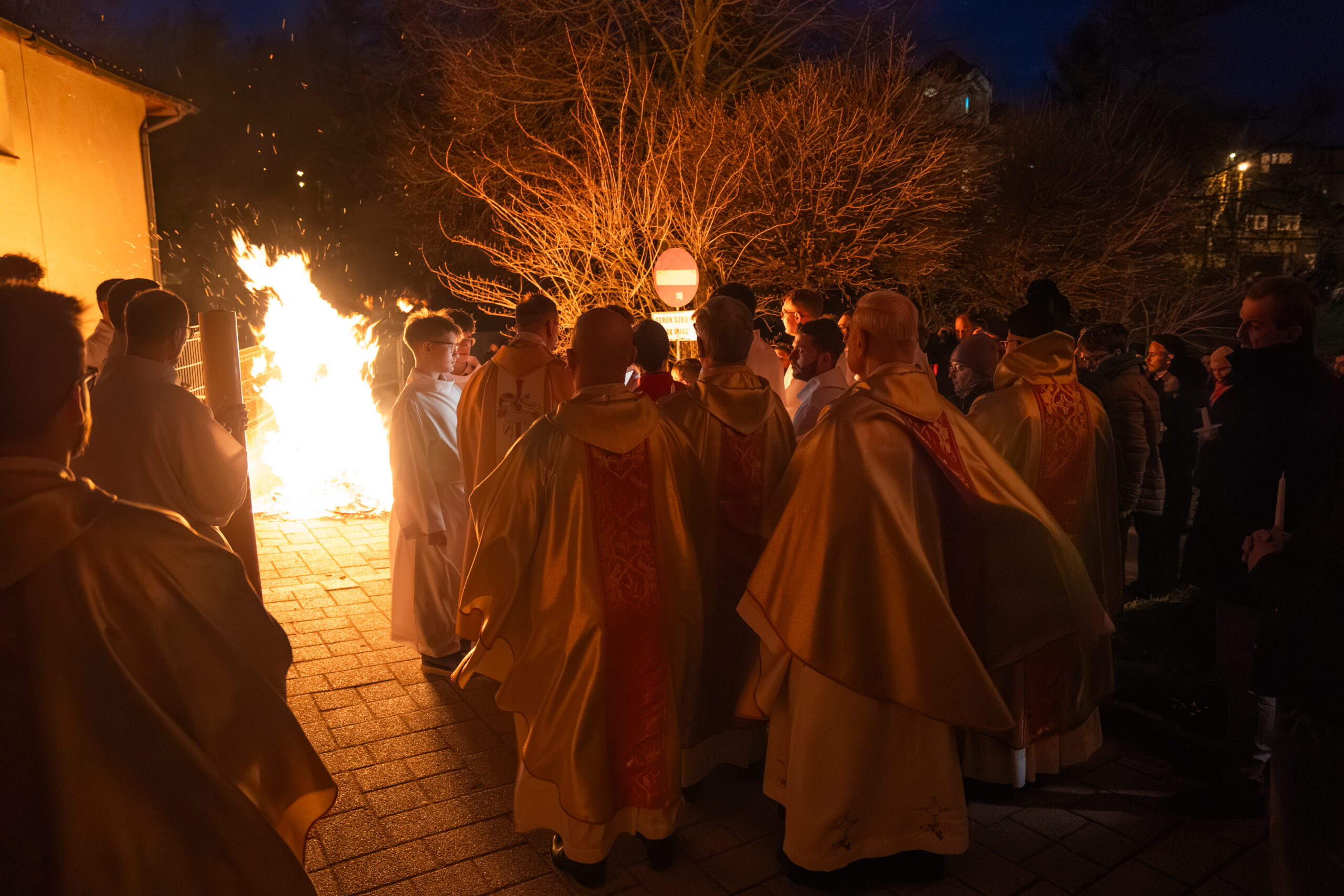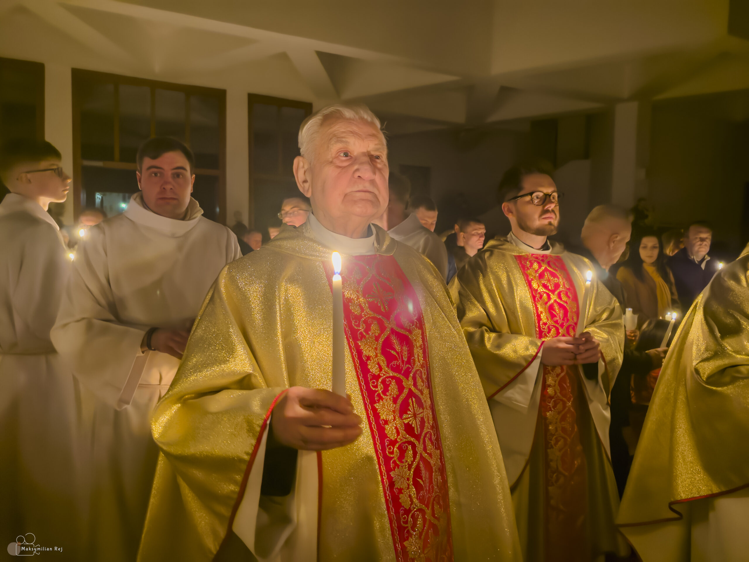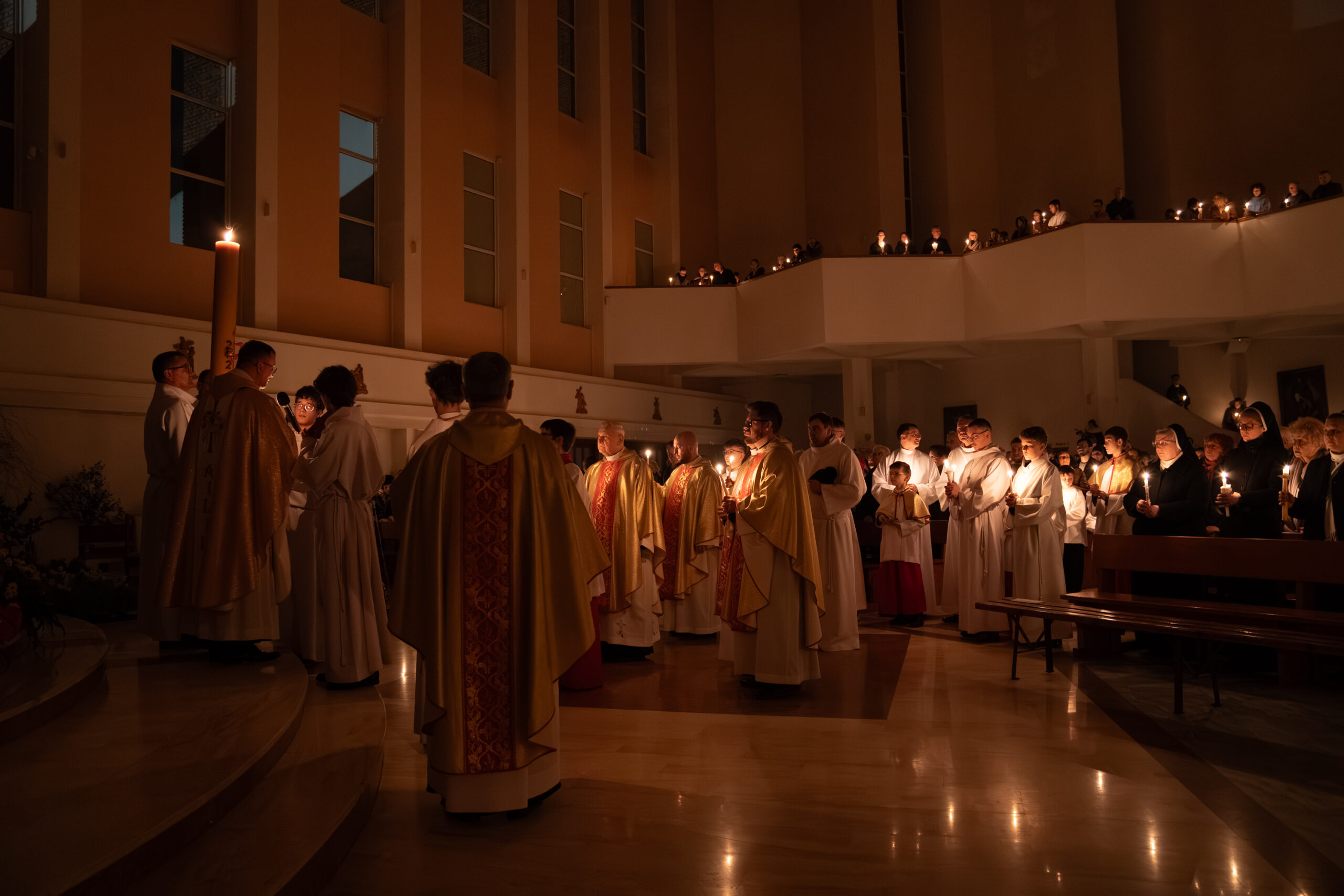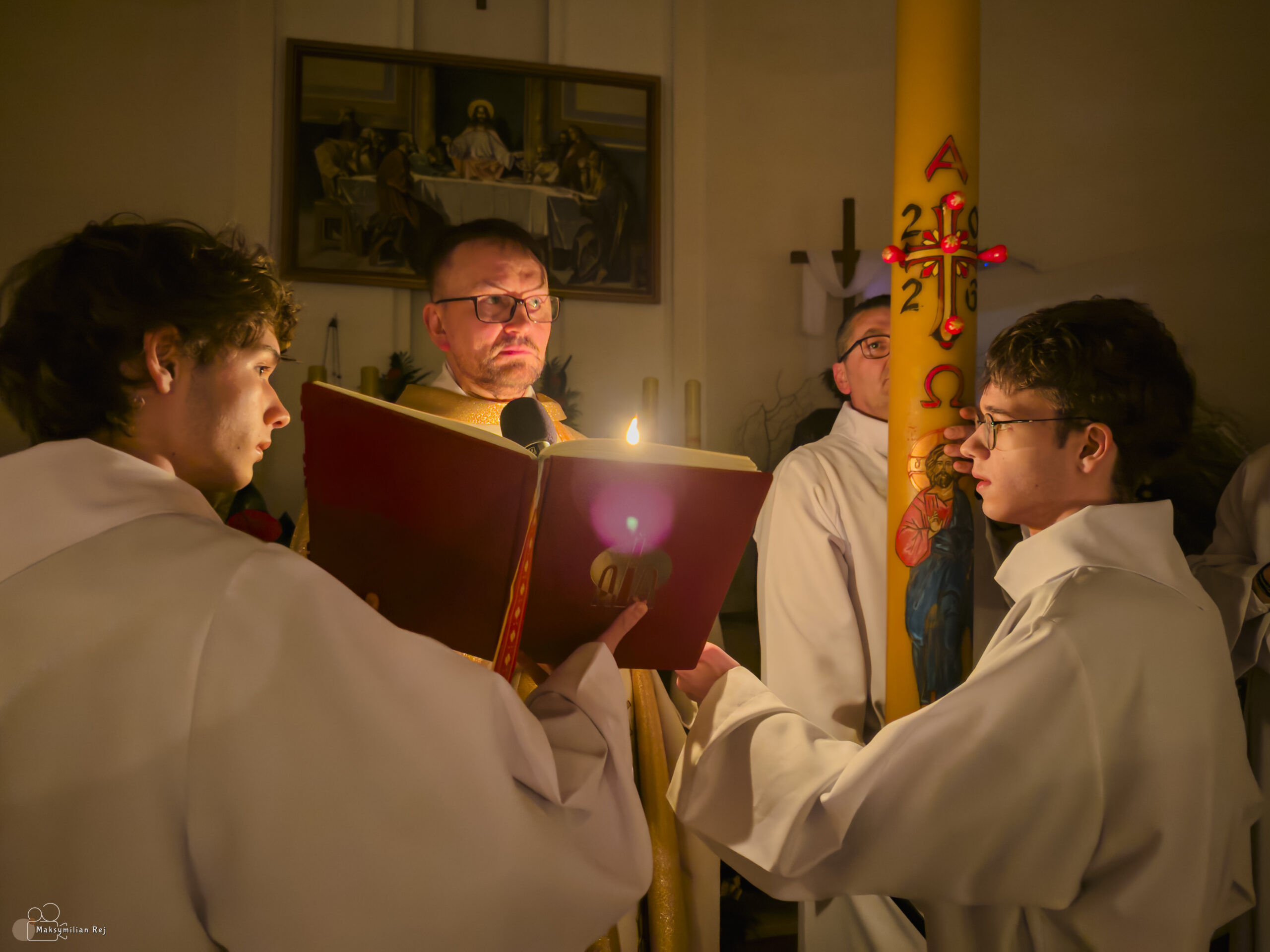 Liturgia rozpoczęła się od obrzędu światła – poświęcenia ognia i zapalenia Paschału, który symbolizuje Chrystusa Zmartwychwstałego, rozpraszającego ciemności grzechu i śmierci. Następnie odśpiewany został przez ks. Dominika Gaładyka, S.A.C., uroczysty Exsultet, czyli starożytne orędzie wielkanocne. Jest to podniosły hymn wykonywany na początku Wigilii Paschalnej, który wzywa całe stworzenie do radości i wychwala Boga za dar zbawienia oraz zwycięstwo Chrystusa nad śmiercią.