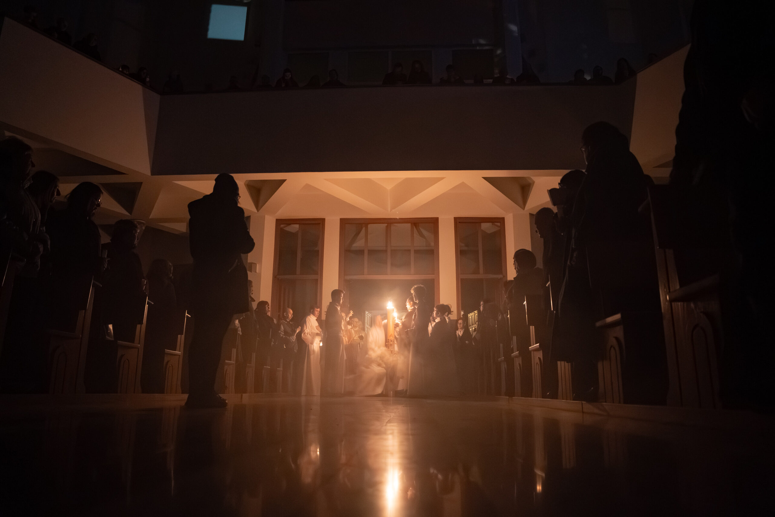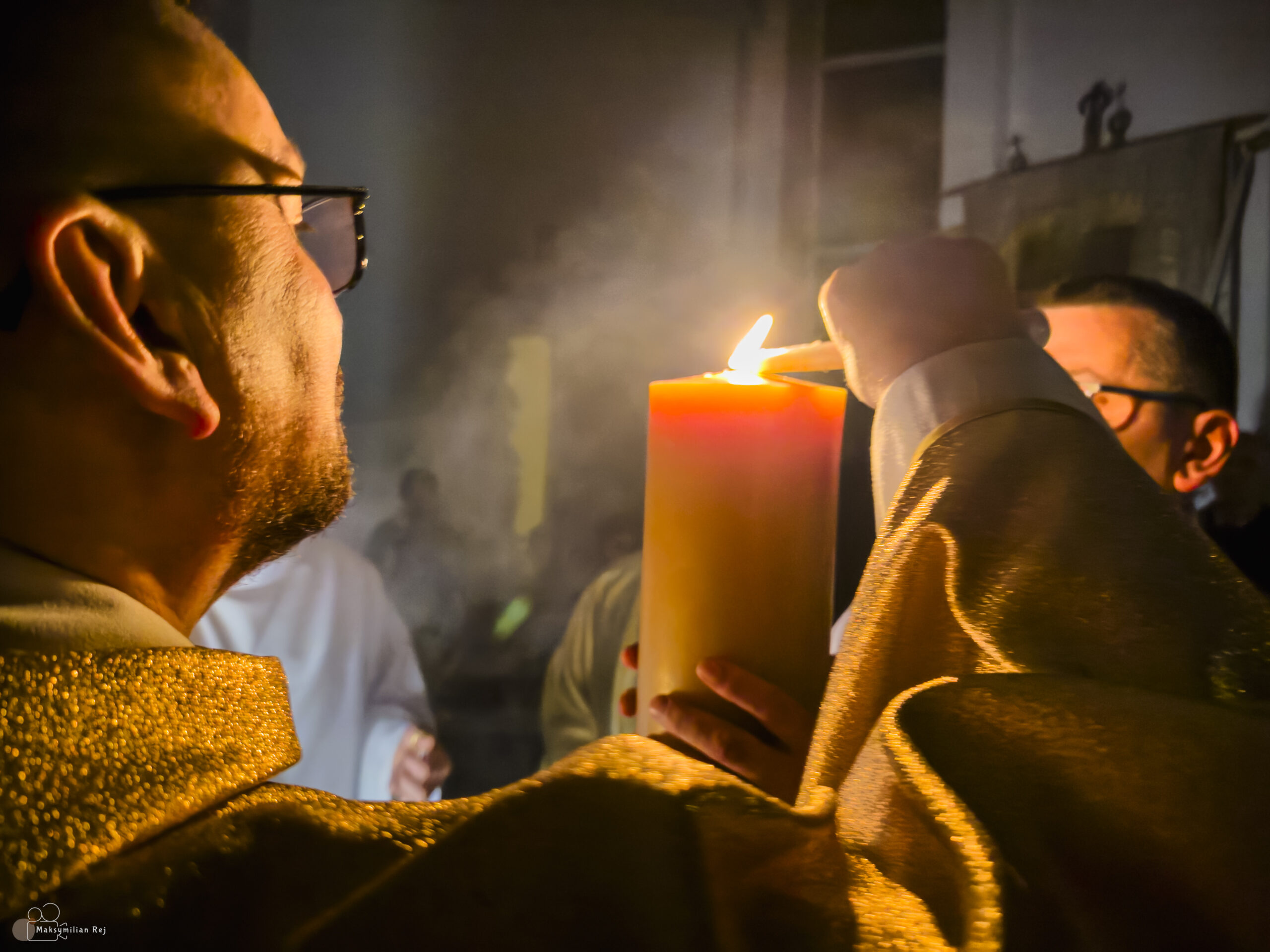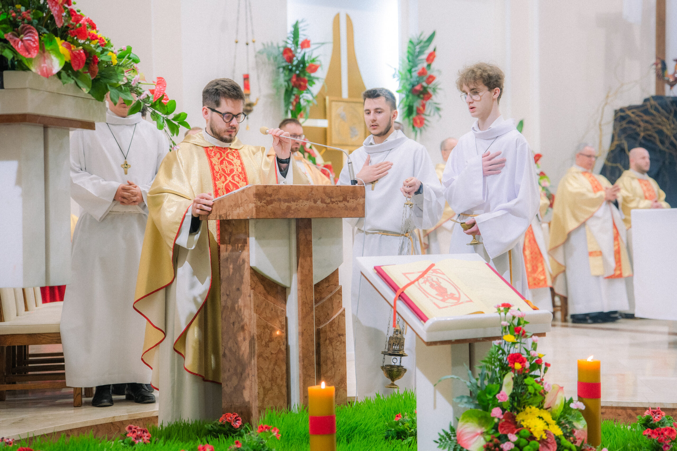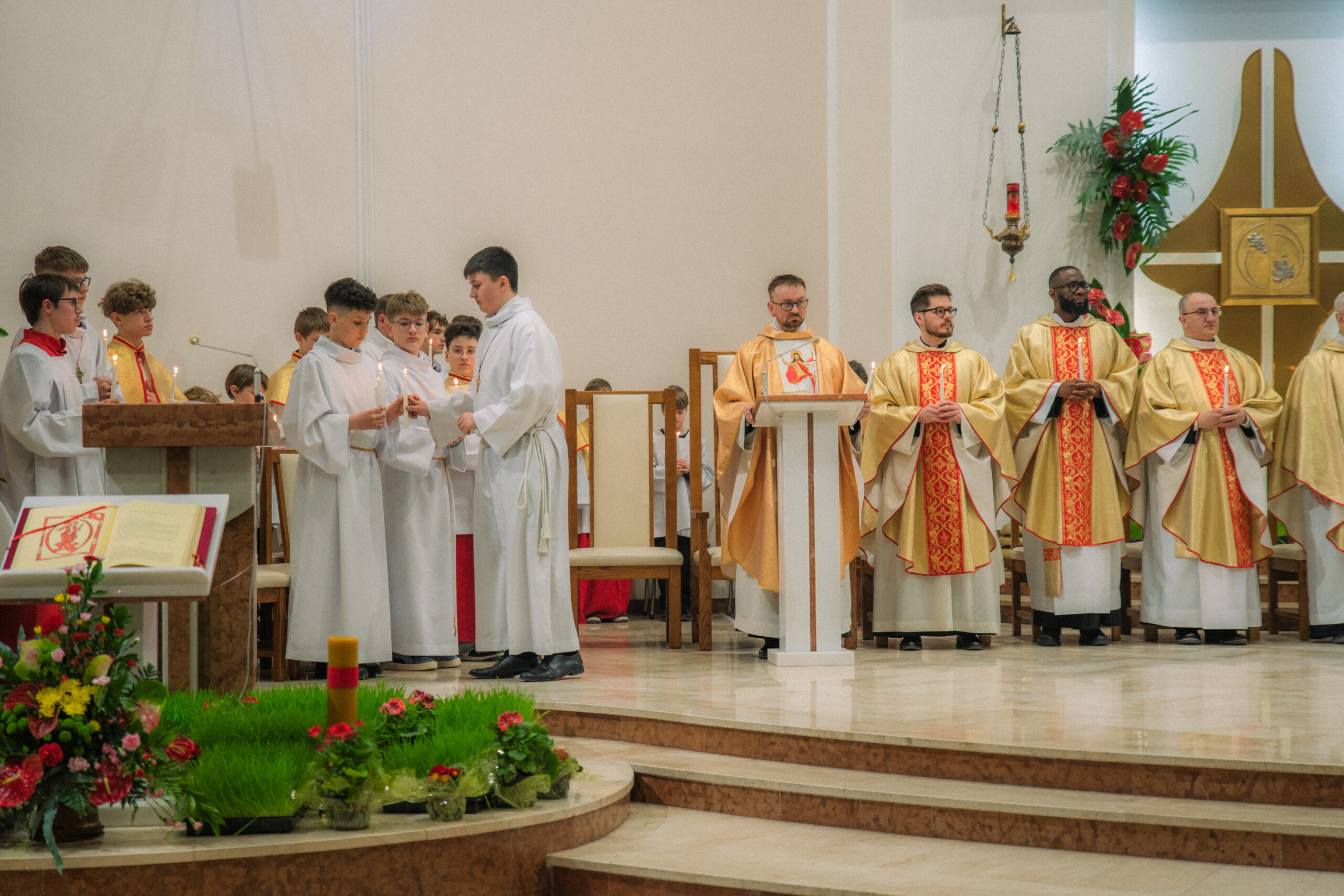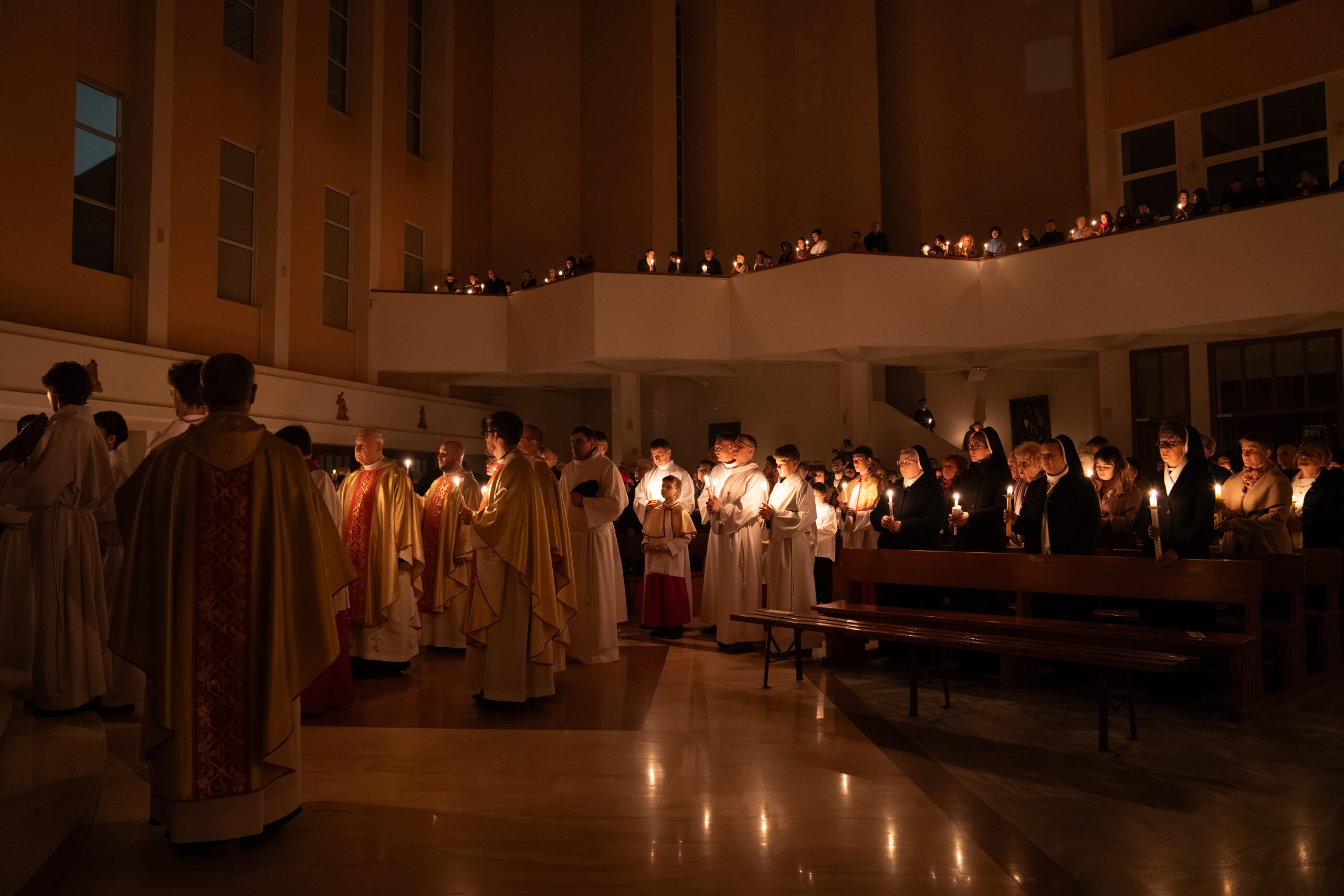 Liturgia rozpoczęła się od obrzędu światła – poświęcenia ognia i zapalenia Paschału, który symbolizuje Chrystusa Zmartwychwstałego, rozpraszającego ciemności grzechu i śmierci. Następnie odśpiewany został przez ks. Dominika Gaładyka, S.A.C., uroczysty Exsultet, czyli starożytne orędzie wielkanocne. Jest to podniosły hymn wykonywany na początku Wigilii Paschalnej, który wzywa całe stworzenie do radości i wychwala Boga za dar zbawienia oraz zwycięstwo Chrystusa nad śmiercią.