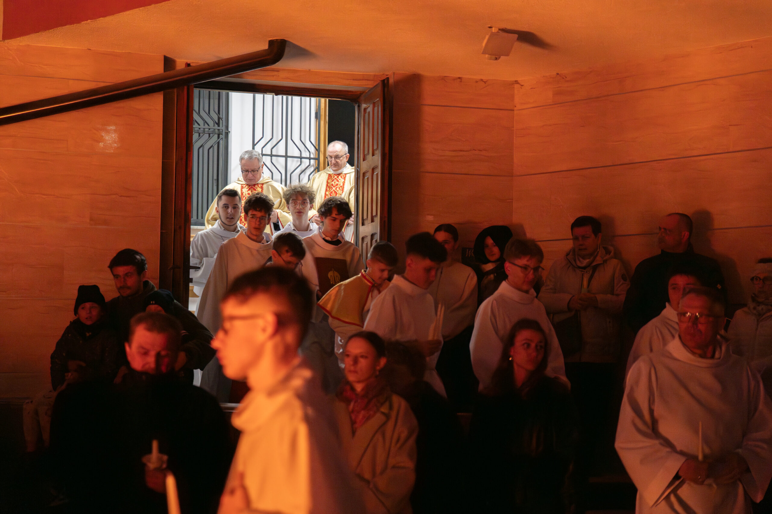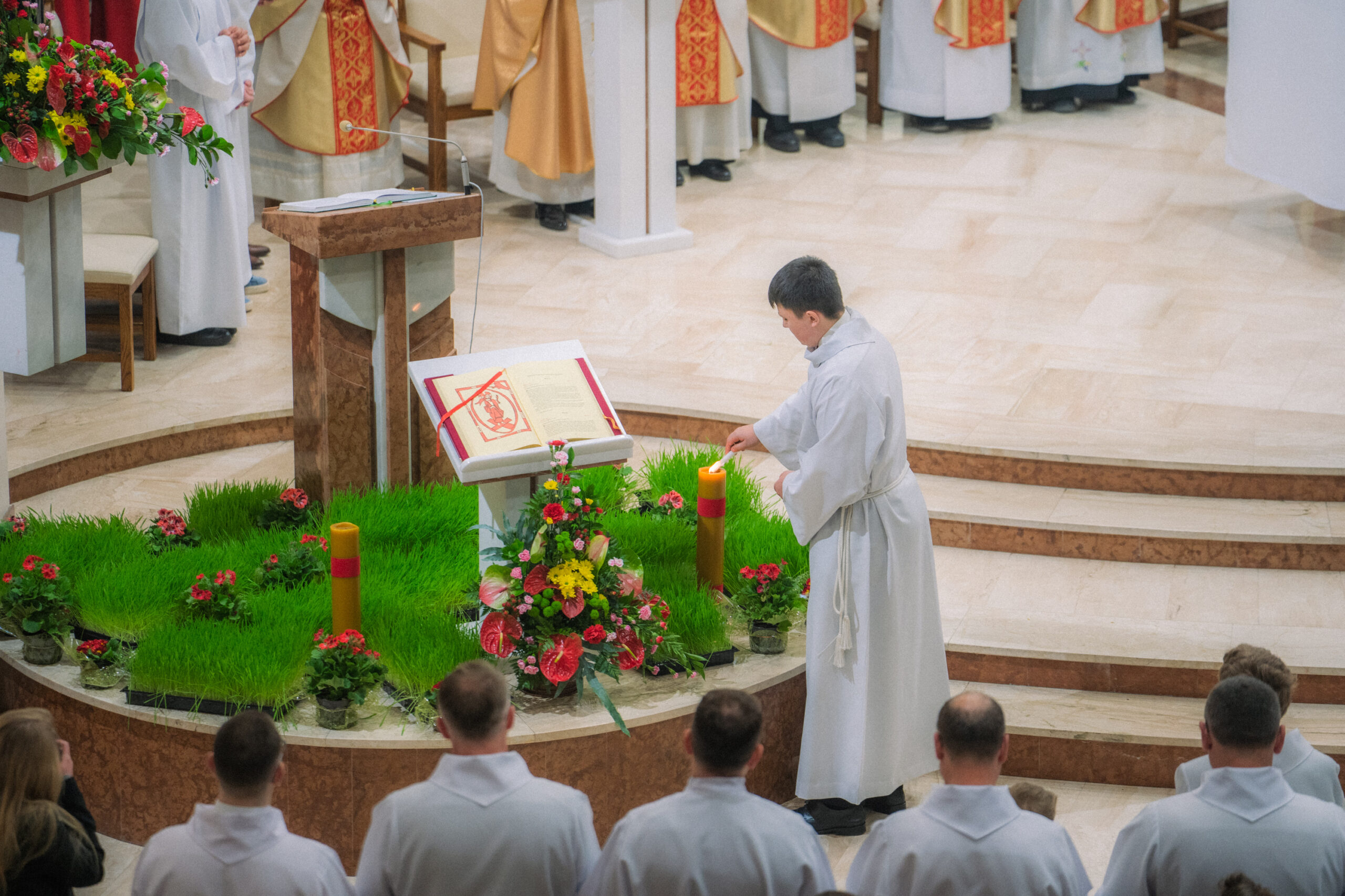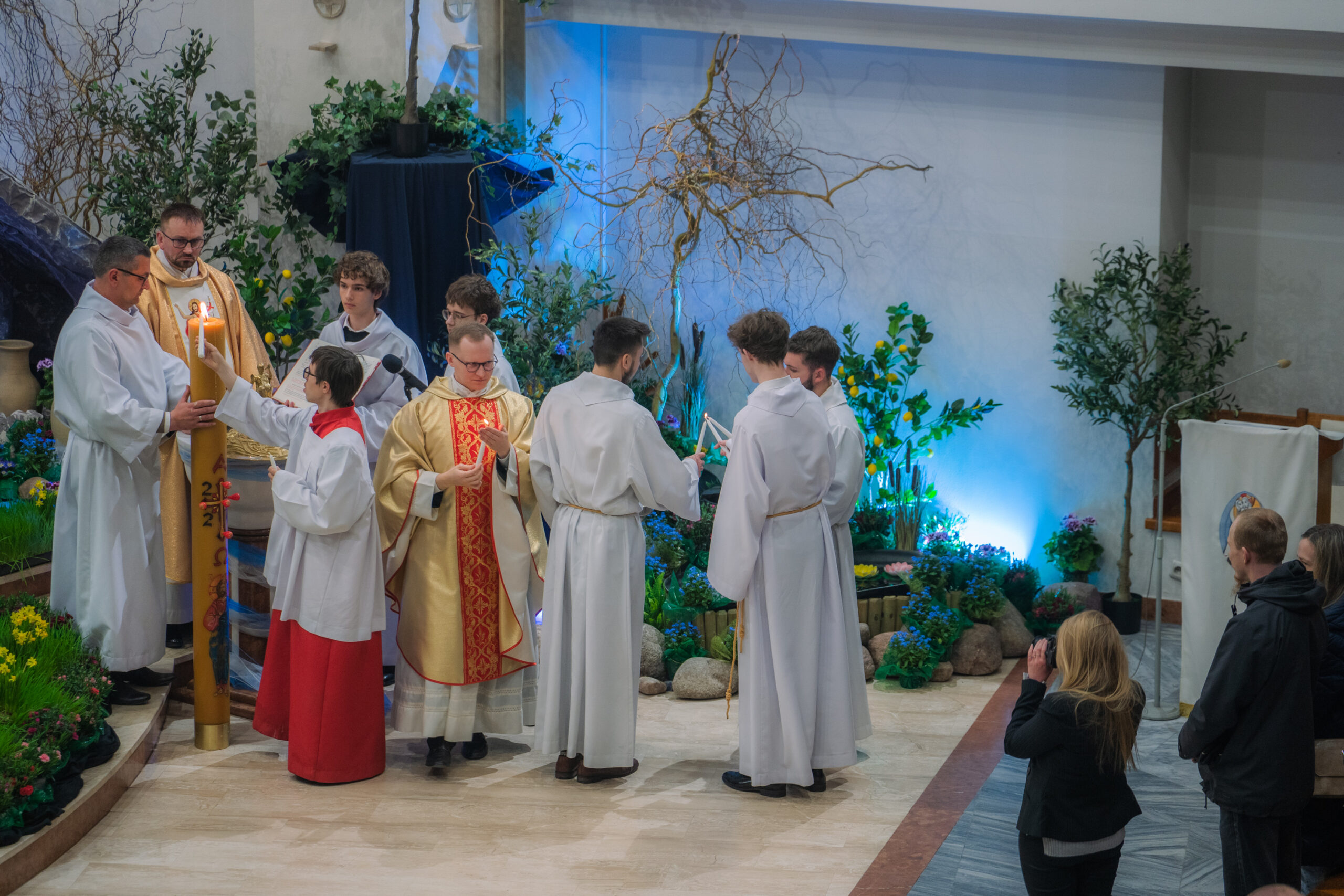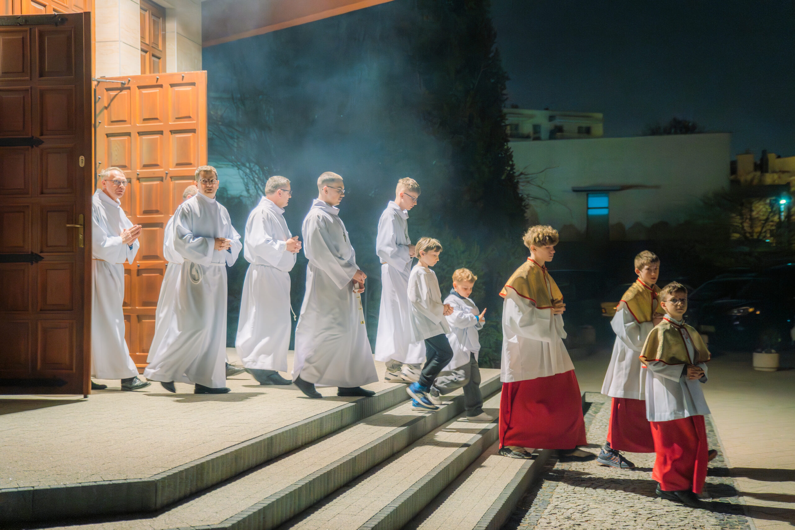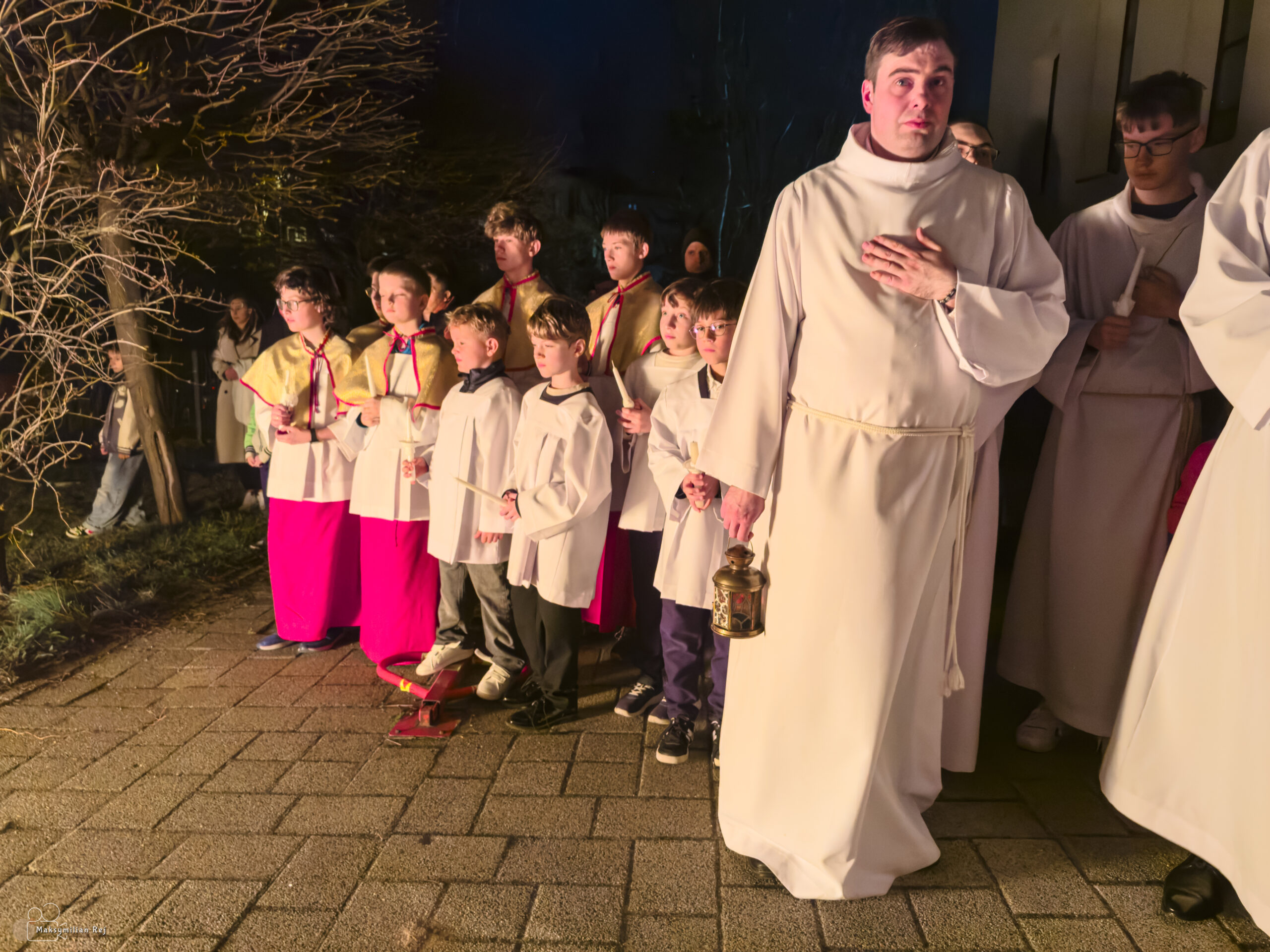 Liturgia rozpoczęła się od obrzędu światła – poświęcenia ognia i zapalenia Paschału, który symbolizuje Chrystusa Zmartwychwstałego, rozpraszającego ciemności grzechu i śmierci. Następnie odśpiewany został przez ks. Dominika Gaładyka, S.A.C., uroczysty Exsultet, czyli starożytne orędzie wielkanocne. Jest to podniosły hymn wykonywany na początku Wigilii Paschalnej, który wzywa całe stworzenie do radości i wychwala Boga za dar zbawienia oraz zwycięstwo Chrystusa nad śmiercią.