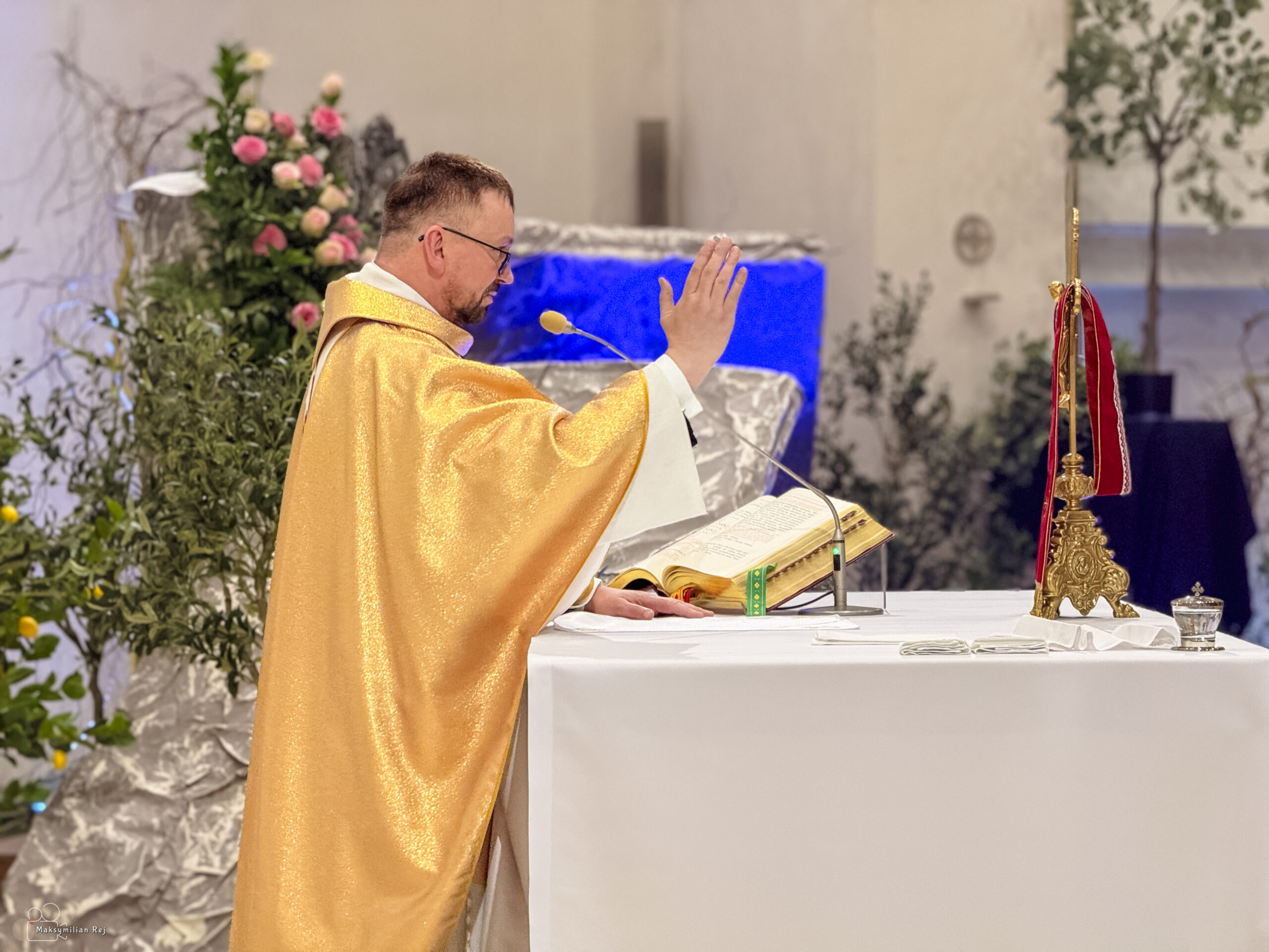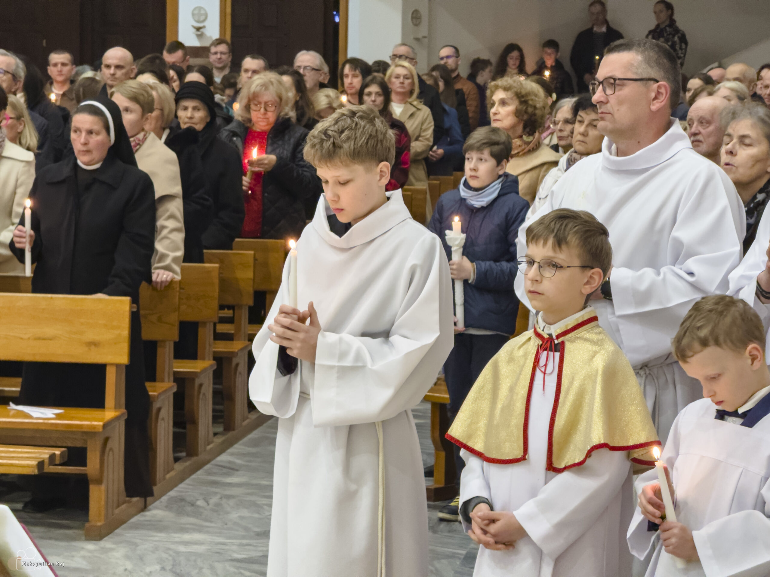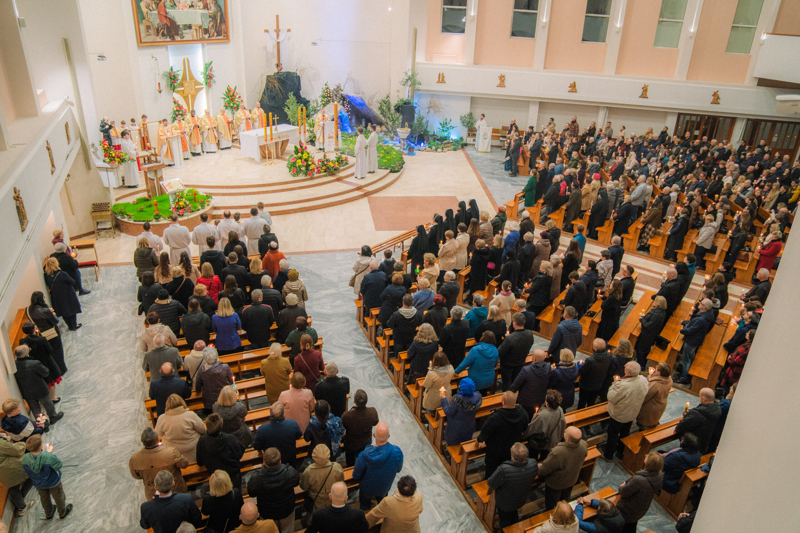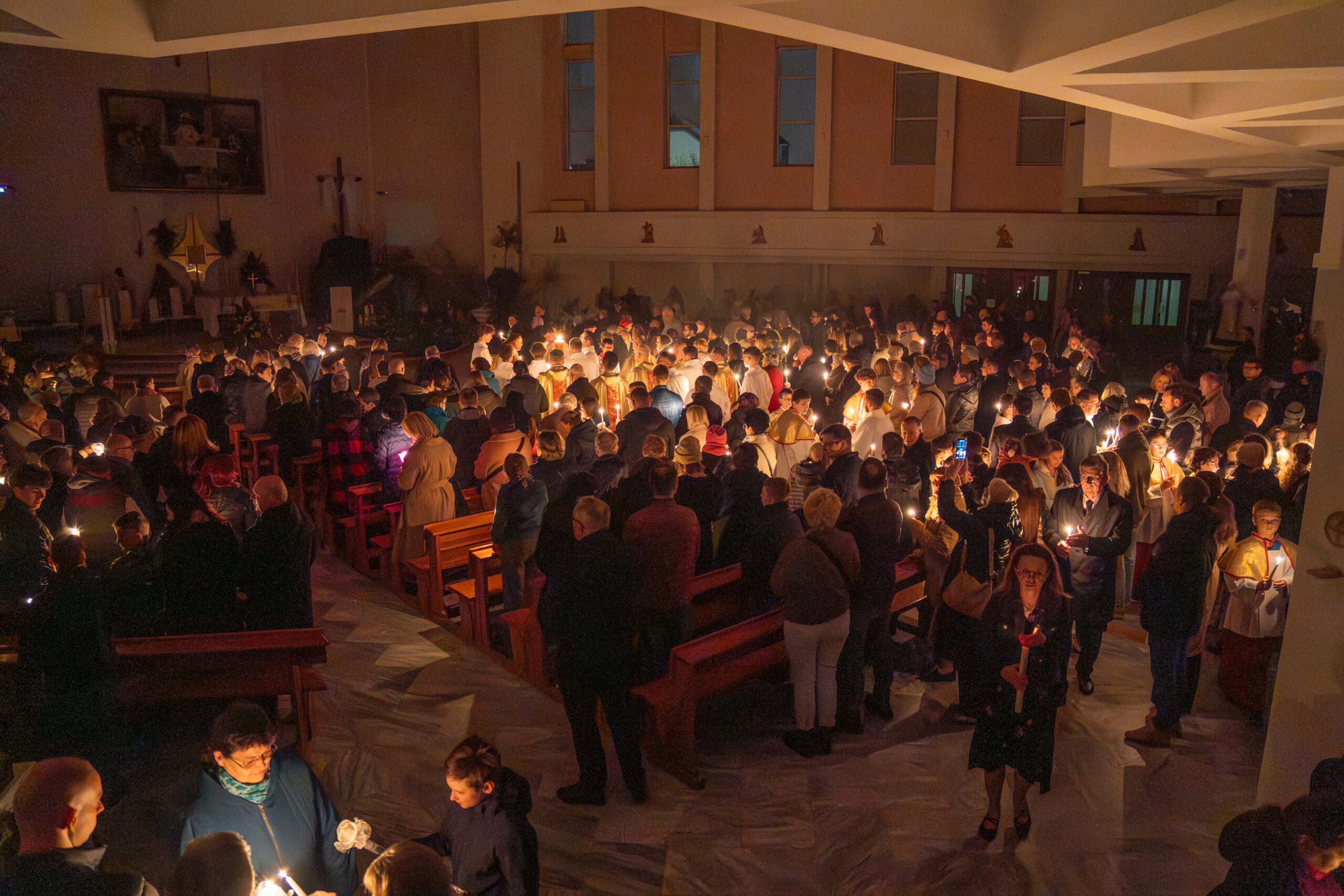 Celebracja Wigilii Paschalnej – najważniejszej liturgii w całym roku kościelnym – 04 kwietnia 2026 r. rozpoczęła się o godz. 20:00. Licznie zgromadzeni wierni wspólnie przeżywali tę wyjątkową noc, wypełnioną modlitwą, skupieniem oraz radością ze Zmartwychwstania Pańskiego. Liturgii przewodniczył ks. Proboszcz Artur Manelski, S.A.C.