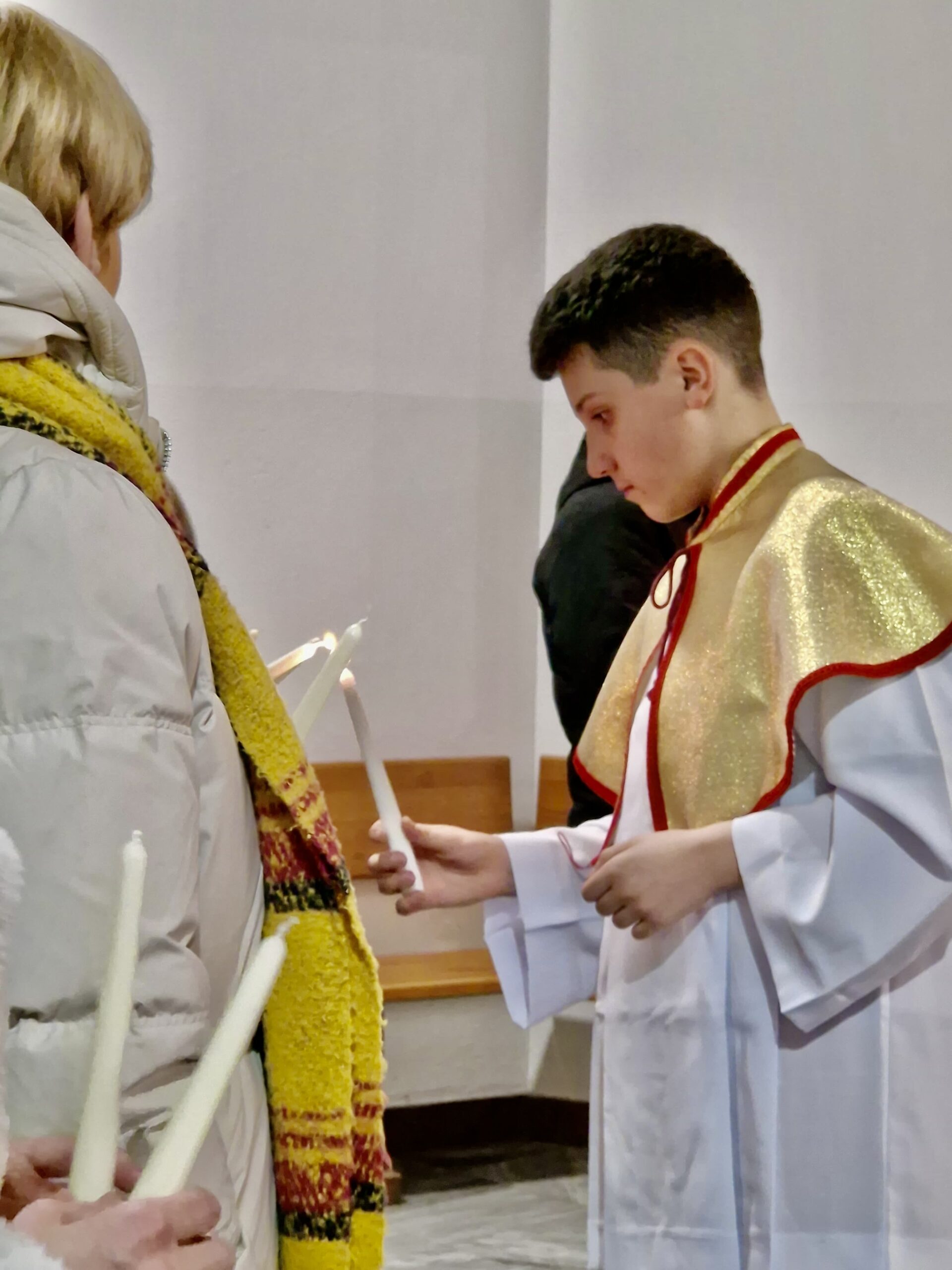 Po homilii ministranci rozdali świece wiernym, a następnie celebrans odmówił modlitwę błogosławieństwa. W ciszy i przy delikatnej muzyce organowej światło było przekazywane kolejnym osobom, stając się widzialnym znakiem wspólnoty i misji.