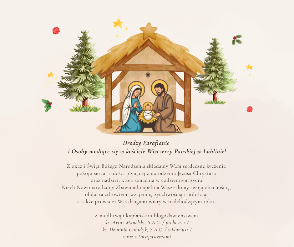 Niech Nowonarodzony Zbawiciel napełnia Wasze domy swoją obecnością, obdarza zdrowiem, wzajemną życzliwością i miłością, a także prowadzi Was drogami wiary w nadchodzącym roku. Życzymy, aby czas świąt był momentem duchowego odnowienia, umocnienia rodzinnych więzi oraz wdzięczności za dar wspólnoty parafialnej.